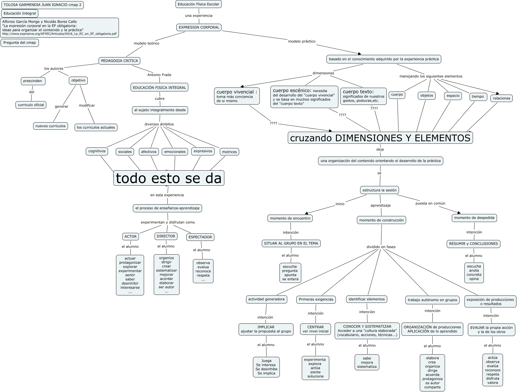 Este Cmap, tiene información relacionada con: TOLOSA_GARMENDIA_JUAN_IGNACIO_cmap_2_FJRA, Educación Física Escolar una experiencia EXPRESION CORPORAL, PEDAGOGIA CRITICA los autores prescinden, exposición de producciones o resultados intención EVAUAR la propia acción y la de los otros, EDUCACIÓN FISICA INTEGRAL cubre al sujeto integralmente desde, basado en el conocimiento adquirido por la experiencia práctica manejando los siguientes elementos relaciones, emocionales ???? todo esto se da, SITUAR AL GRUPO EN EL TEMA el alumno escucha pregunta apunta se entera, identificar elementos intención CONOCER Y SISTEMATIZAR Acceder a una "cultura elaborada" (vocabulario, acciones, técnicas...), IMPLICAR ajustar la propuesta al grupo el alumno Juega Se interesa Se desinhibe Se implica, cuerpo texto: significados de nuestros gestos, posturas,etc. ???? cruzando DIMENSIONES Y ELEMENTOS, CONOCER Y SISTEMATIZAR Acceder a una "cultura elaborada" (vocabulario, acciones, técnicas...) el alumno sabe mejora sistematiza, EXPRESION CORPORAL modelo práctico basado en el conocimiento adquirido por la experiencia práctica, momento de despedida intención RESUMIR y CONCLUSIONES, tiempo cruzando DIMENSIONES Y ELEMENTOS, basado en el conocimiento adquirido por la experiencia práctica manejando los siguientes elementos objetos, actividad generadora intención IMPLICAR ajustar la propuesta al grupo, cuerpo cruzando DIMENSIONES Y ELEMENTOS, sociales ???? todo esto se da, DIRECTOR el alumno organiza dirigir crear sistematizar mejorar acordar elaborar ser autor ..., estructura la sesión inicio momento de encuentro