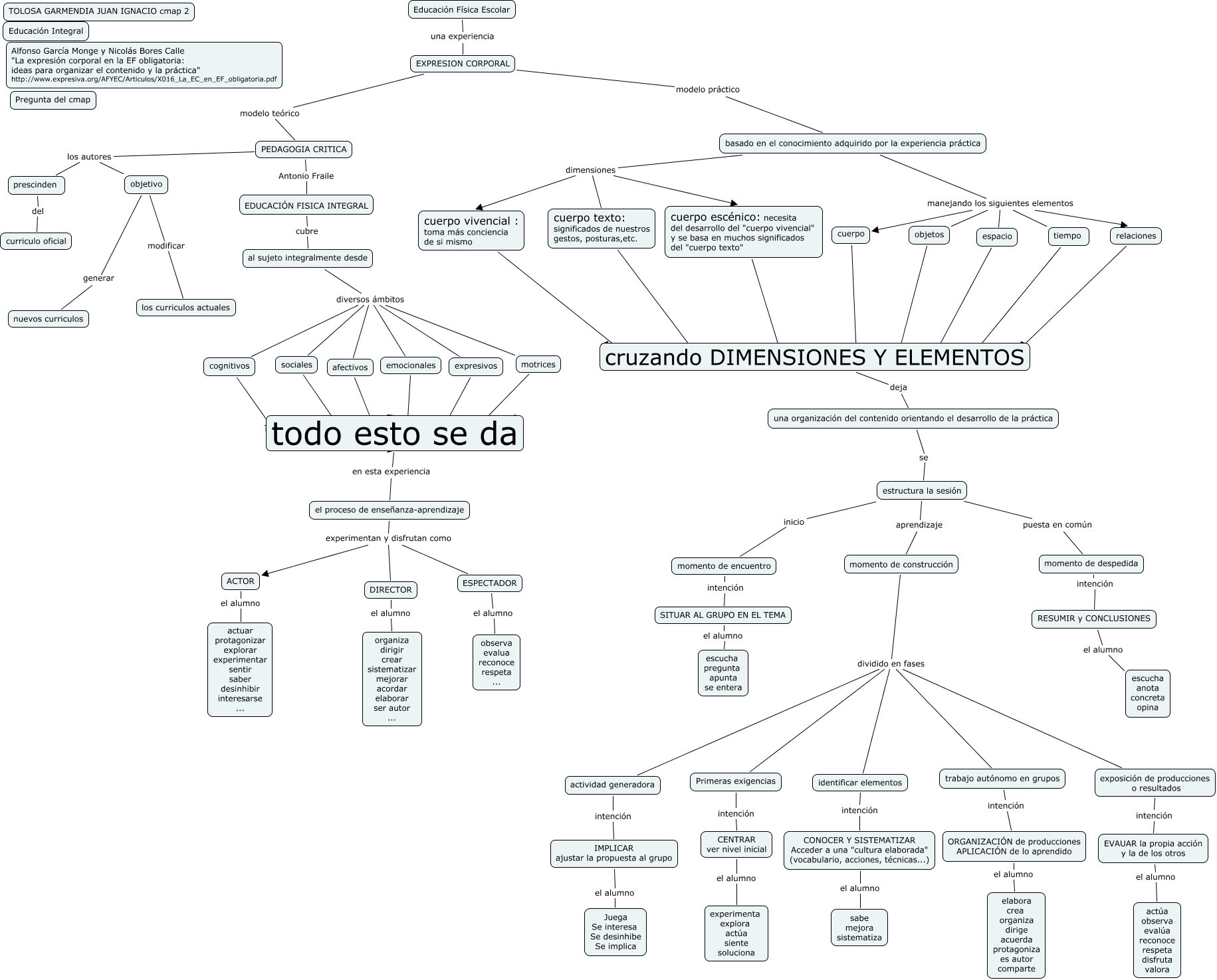 Este Cmap, tiene información relacionada con: TOLOSA_GARMENDIA_JUAN_IGNACIO_cmap_2, PEDAGOGIA CRITICA los autores prescinden, Educación Física Escolar una experiencia EXPRESION CORPORAL, exposición de producciones o resultados intención EVAUAR la propia acción y la de los otros, cuerpo texto: significados de nuestros gestos, posturas,etc. cruzando DIMENSIONES Y ELEMENTOS, EDUCACIÓN FISICA INTEGRAL cubre al sujeto integralmente desde, emocionales ???? todo esto se da, basado en el conocimiento adquirido por la experiencia práctica manejando los siguientes elementos relaciones, SITUAR AL GRUPO EN EL TEMA el alumno escucha pregunta apunta se entera, IMPLICAR ajustar la propuesta al grupo el alumno Juega Se interesa Se desinhibe Se implica, identificar elementos intención CONOCER Y SISTEMATIZAR Acceder a una "cultura elaborada" (vocabulario, acciones, técnicas...), EXPRESION CORPORAL modelo práctico basado en el conocimiento adquirido por la experiencia práctica, CONOCER Y SISTEMATIZAR Acceder a una "cultura elaborada" (vocabulario, acciones, técnicas...) el alumno sabe mejora sistematiza, momento de despedida intención RESUMIR y CONCLUSIONES, tiempo cruzando DIMENSIONES Y ELEMENTOS, basado en el conocimiento adquirido por la experiencia práctica manejando los siguientes elementos objetos, DIRECTOR el alumno organiza dirigir crear sistematizar mejorar acordar elaborar ser autor ..., sociales ???? todo esto se da, cuerpo cruzando DIMENSIONES Y ELEMENTOS, actividad generadora intención IMPLICAR ajustar la propuesta al grupo, PEDAGOGIA CRITICA los autores objetivo