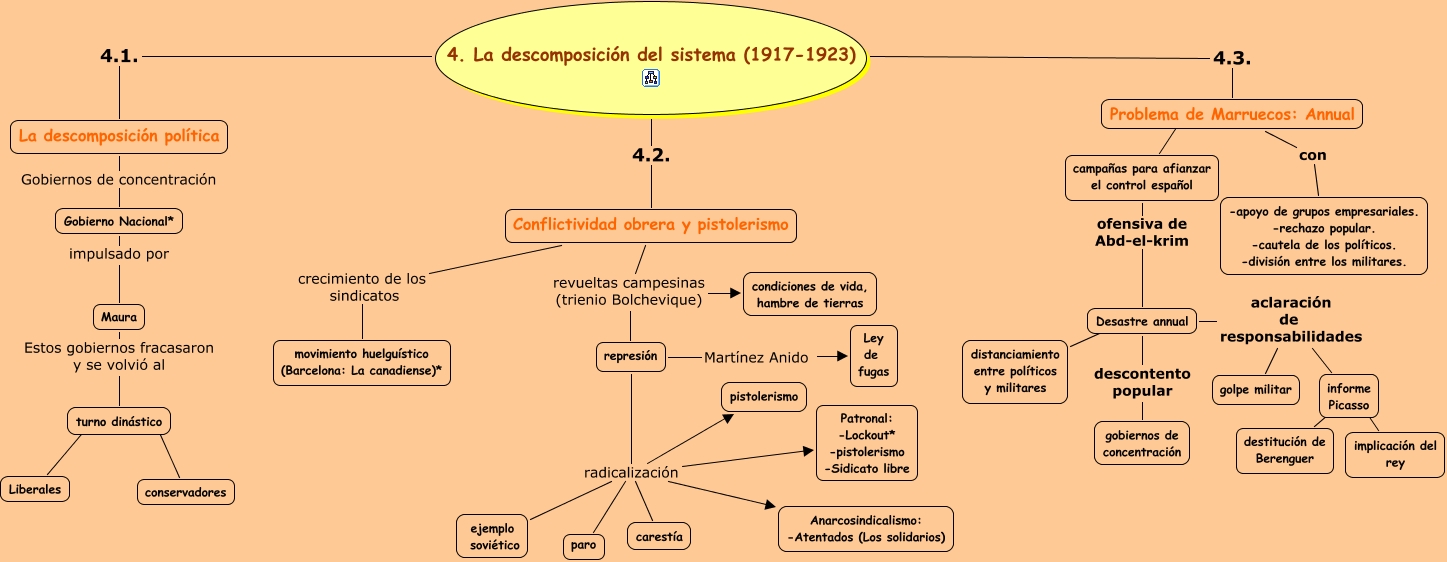 Este Cmap, tiene información relacionada con: punto 4, 4. La descomposición del sistema (1917-1923) 4.3. Problema de Marruecos: Annual, La descomposición política Gobiernos de concentración Gobierno Nacional*, Desastre annual aclaración de responsabilidades golpe militar, Conflictividad obrera y pistolerismo revueltas campesinas (trienio Bolchevique) represión, Desastre annual ???? distanciamiento entre políticos y militares, turno dinástico ???? Liberales, Gobierno Nacional* impulsado por Maura, 4. La descomposición del sistema (1917-1923) 4.1. La descomposición política, turno dinástico ???? conservadores, Desastre annual descontento popular gobiernos de concentración, informe Picasso ???? destitución de Berenguer, represión radicalización ejemplo soviético, Problema de Marruecos: Annual con -apoyo de grupos empresariales. -rechazo popular. -cautela de los políticos. -división entre los militares., 4. La descomposición del sistema (1917-1923) 4.2. Conflictividad obrera y pistolerismo, campañas para afianzar el control español ofensiva de Abd-el-krim Desastre annual, Desastre annual aclaración de responsabilidades informe Picasso, Conflictividad obrera y pistolerismo crecimiento de los sindicatos movimiento huelguístico (Barcelona: La canadiense)*, represión radicalización pistolerismo, represión radicalización paro, Maura Estos gobiernos fracasaron y se volvió al turno dinástico
