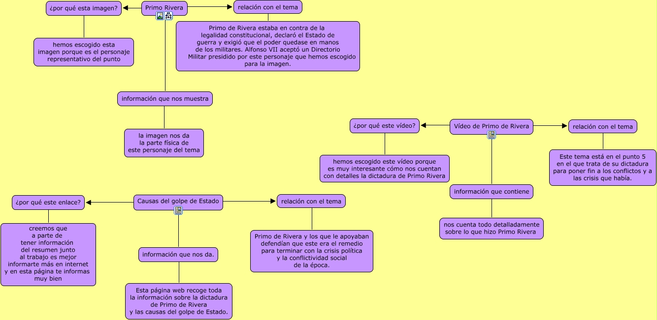 Este Cmap, tiene información relacionada con: fotos, enlaces y vídeos punto 5, información que nos da. ???? Esta página web recoge toda la información sobre la dictadura de Primo de Rivera y las causas del golpe de Estado., relación con el tema ???? Primo de Rivera y los que le apoyaban defendían que este era el remedio para terminar con la crisis política y la conflictividad social de la época., información que nos muestra ???? la imagen nos da la parte física de este personaje del tema, Causas del golpe de Estado ???? relación con el tema, ¿por qué esta imagen? ???? hemos escogido esta imagen porque es el personaje representativo del punto, Vídeo de Primo de Rivera ???? ¿por qué este vídeo?, relación con el tema ???? Este tema está en el punto 5 en el que trata de su dictadura para poner fin a los conflictos y a las crisis que había., Primo Rivera ???? ¿por qué esta imagen?, ¿por qué este vídeo? ???? hemos escogido este vídeo porque es muy interesante cómo nos cuentan con detalles la dictadura de Primo Rivera, información que contiene ???? nos cuenta todo detalladamente sobre lo que hizo Primo Rivera, Primo Rivera ???? relación con el tema, Vídeo de Primo de Rivera ???? información que contiene, ¿por qué este enlace? ???? creemos que a parte de tener información del resumen junto al trabajo es mejor informarte más en internet y en esta página te informas muy bien, Vídeo de Primo de Rivera ???? relación con el tema, Causas del golpe de Estado ???? información que nos da., relación con el tema ???? Primo de Rivera estaba en contra de la legalidad constitucional, declaró el Estado de guerra y exigió que el poder quedase en manos de los militares. Alfonso VII aceptó un Directorio Militar presidido por este personaje que hemos escogido para la imagen., Causas del golpe de Estado ???? ¿por qué este enlace?, Primo Rivera ???? información que nos muestra
