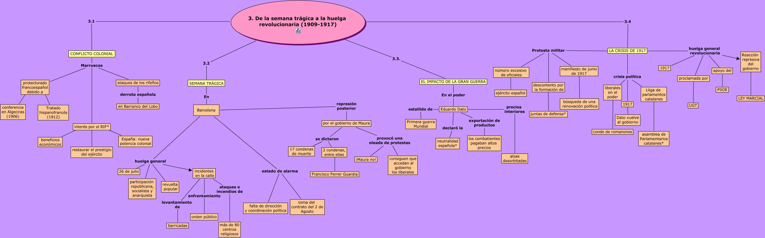 Este Cmap, tiene información relacionada con: punto 3, Lliga de parlamentos catalanes ???? asamblea de Parlamentarios catalanes*, Eduardo Dato exportación de productos los combatientes pagaban altos precios, Eduardo Dato precios interiores alzas desorbitadas, Barcelona huelga general participación republicana, socialista y anarquista, interés por el RIF* ???? España: nueva potencia colonial, LA CRISIS DE 1917 Protesta militar manifiesto de junio de 1917, incidentes en la calle ataques e incendios de más de 80 centros religiosos, por el gobierno de Maura se dictaron 2 condenas, entre ellas, por el gobierno de Maura provocó una oleada de protestas consiguen que accedan al gobierno los liberales, LA CRISIS DE 1917 huelga general revolucionaria 1917, LA CRISIS DE 1917 Protesta militar número excesivo de oficiales, CONFLICTO COLONIAL Marruecos protectorado francoespañol debido a, LA CRISIS DE 1917 crisis política 1917, EL IMPACTO DE LA GRAN GUERRA En el poder Eduardo Dato, por el gobierno de Maura se dictaron 17 condenas de muerte, Barcelona represión posterior por el gobierno de Maura, LA CRISIS DE 1917 huelga general revolucionaria apoyo del, manifiesto de junio de 1917 ???? búsqueda de una renovación política, descontento por la formación de ???? juntas de defensa*, Barcelona huelga general revuelta popular