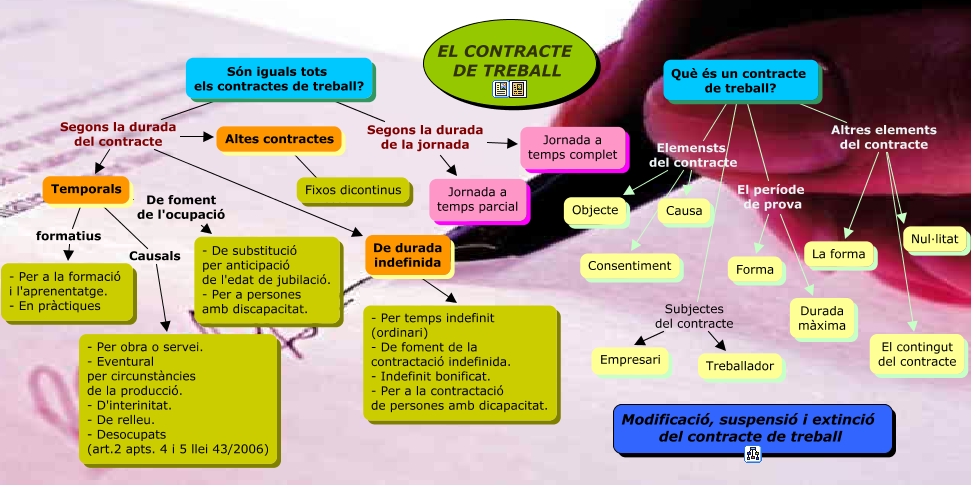 Este Cmap, tiene información relacionada con: El contracte de treball, Són iguals tots els contractes de treball? Segons la durada de la jornada Jornada a temps complet, Què és un contracte de treball? Subjectes del contracte Empresari, Què és un contracte de treball? Altres elements del contracte El contingut del contracte, Són iguals tots els contractes de treball? Segons la durada del contracte De durada indefinida, Són iguals tots els contractes de treball? Segons la durada del contracte Altes contractes, Temporals formatius - Per a la formació i l'aprenentatge. - En pràctiques, Què és un contracte de treball? Elemensts del contracte Consentiment, Què és un contracte de treball? Subjectes del contracte Treballador, Què és un contracte de treball? Altres elements del contracte La forma, Són iguals tots els contractes de treball? Segons la durada de la jornada Jornada a temps parcial, Temporals De foment de l'ocupació - De substitució per anticipació de l'edat de jubilació. - Per a persones amb discapacitat., De durada indefinida ???? - Per temps indefinit (ordinari) - De foment de la contractació indefinida. - Indefinit bonificat. - Per a la contractació de persones amb dicapacitat., Què és un contracte de treball? Altres elements del contracte Nul·litat, Temporals Causals - Per obra o servei. - Eventural per circunstàncies de la producció. - D'interinitat. - De relleu. - Desocupats (art.2 apts. 4 i 5 llei 43/2006), Són iguals tots els contractes de treball? Segons la durada del contracte Temporals, Què és un contracte de treball? El període de prova Forma, Altes contractes ???? Fixos dicontinus, Què és un contracte de treball? El període de prova Durada màxima, Què és un contracte de treball? Elemensts del contracte Objecte, Què és un contracte de treball? Elemensts del contracte Causa