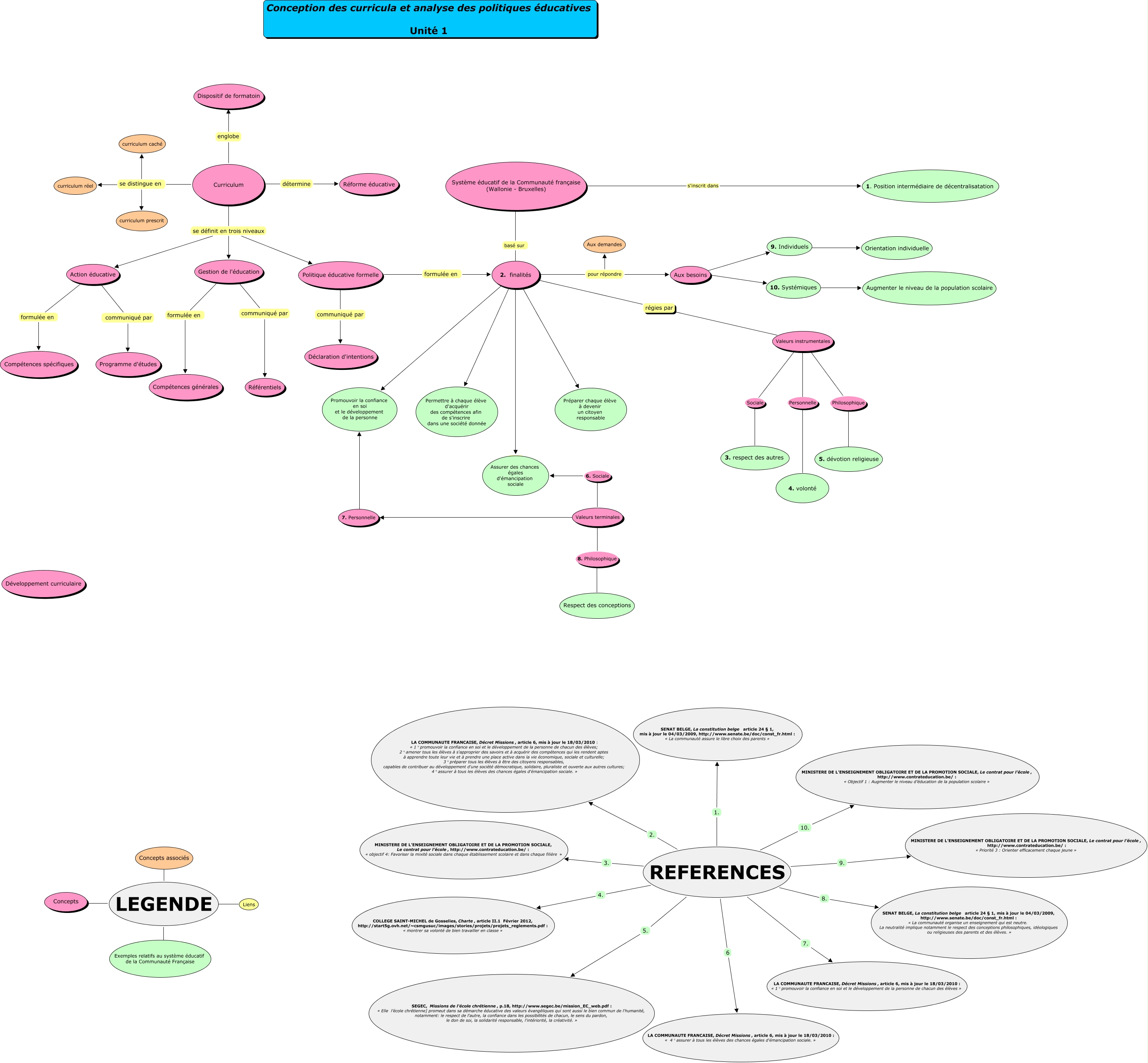 Cette carte de concepts créée avec IHMC CmapTools traite de: Unité 1 Version corrigée, Action éducative communiqué par Programme d'études, LEGENDE ???? Concepts associés, 10. Systémiques ???? Augmenter le niveau de la population scolaire, REFERENCES 5. SEGEC, Missions de l'école chrétienne, p.18, http://www.segec.be/mission_EC_web.pdf : « Elle l’école chrétienne] promeut dans sa démarche éducative des valeurs évangéliques qui sont aussi le bien commun de l'humanité, notamment: le respect de l'autre, la confiance dans les possibilités de chacun, le sens du pardon, le don de soi, la solidarité responsable, l'intériorité, la créativité. », Curriculum se définit en trois niveaux Action éducative, LEGENDE ???? Exemples relatifs au système éducatif de la Communauté Française, REFERENCES 1. SENAT BELGE, La constitution belge article 24 § 1, mis à jour le 04/03/2009, http://www.senate.be/doc/const_fr.html : « La communauté assure le libre choix des parents », Politique éducative formelle communiqué par Déclaration d'intentions, REFERENCES 3. MINISTERE DE L’ENSEIGNEMENT OBLIGATOIRE ET DE LA PROMOTION SOCIALE, Le contrat pour l’école, http://www.contrateducation.be/ : « objectif 4: Favoriser la mixité sociale dans chaque établissement scolaire et dans chaque filière », Curriculum se distingue en curriculum réel, Aux besoins ???? 10. Systémiques, Politique éducative formelle formulée en 2. finalités, Système éducatif de la Communauté française (Wallonie - Bruxelles) s'inscrit dans 1. Position intermédiaire de décentralisatation, REFERENCES 4. COLLEGE SAINT-MICHEL de Gosselies, Charte, article II.1 Février 2012, http://start5g.ovh.net/~csmgusuc/images/stories/projets/projets_reglements.pdf : « montrer sa volonté de bien travailler en classe », Curriculum se définit en trois niveaux Politique éducative formelle, REFERENCES 10. MINISTERE DE L’ENSEIGNEMENT OBLIGATOIRE ET DE LA PROMOTION SOCIALE, Le contrat pour l’école, http://www.contrateducation.be/ : « Objectif 1 : Augmenter le niveau d’éducation de la population scolaire », Curriculum englobe Dispositif de formatoin, 2. finalités pour répondre Aux besoins, Valeurs terminales 8. Philosophique Respect des conceptions, Valeurs instrumentales Sociale 3. respect des autres
