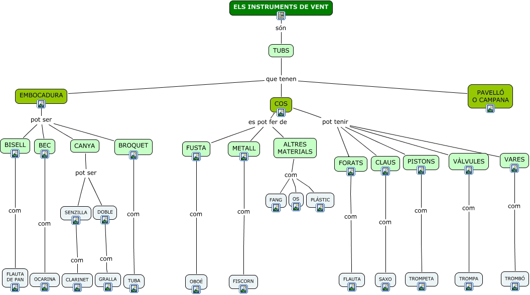 Aquest mapa conceptual conté informació relacionada amb: CM instruments_vent 4A, COS pot tenir VARES, FORATS com FLAUTA, ALTRES MATERIALS com OS, TUBS que tenen PAVELLÓ O CAMPANA, DOBLE com GRALLA, VÀLVULES com TROMPA, BISELL com FLAUTA DE PAN, ELS INSTRUMENTS DE VENT són TUBS, COS pot tenir CLAUS, EMBOCADURA pot ser BISELL, TUBS que tenen COS, COS es pot fer de FUSTA, CLAUS com SAXO, PISTONS com TROMPETA, CANYA pot ser SENZILLA, EMBOCADURA pot ser CANYA, EMBOCADURA pot ser BROQUET, TUBS que tenen EMBOCADURA, BEC com OCARINA, FUSTA com OBOÈ