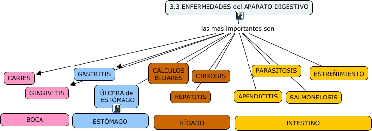 Este Cmap, tiene información relacionada con: 3.4 Enfermedades del aparato digestivo, 3.3 ENFERMEDADES del APARATO DIGESTIVO las más importantes son CIRROSIS, 3.3 ENFERMEDADES del APARATO DIGESTIVO las más importantes son APENDICITIS, 3.3 ENFERMEDADES del APARATO DIGESTIVO las más importantes son ÚLCERA de ESTÓMAGO, 3.3 ENFERMEDADES del APARATO DIGESTIVO las más importantes son CARIES, 3.3 ENFERMEDADES del APARATO DIGESTIVO las más importantes son SALMONELOSIS, 3.3 ENFERMEDADES del APARATO DIGESTIVO las más importantes son GINGIVITIS, 3.3 ENFERMEDADES del APARATO DIGESTIVO las más importantes son CÁLCULOS BILIARES, 3.3 ENFERMEDADES del APARATO DIGESTIVO las más importantes son PARASITOSIS, 3.3 ENFERMEDADES del APARATO DIGESTIVO las más importantes son GASTRITIS, 3.3 ENFERMEDADES del APARATO DIGESTIVO las más importantes son ESTREÑIMIENTO, 3.3 ENFERMEDADES del APARATO DIGESTIVO las más importantes son HEPATITIS