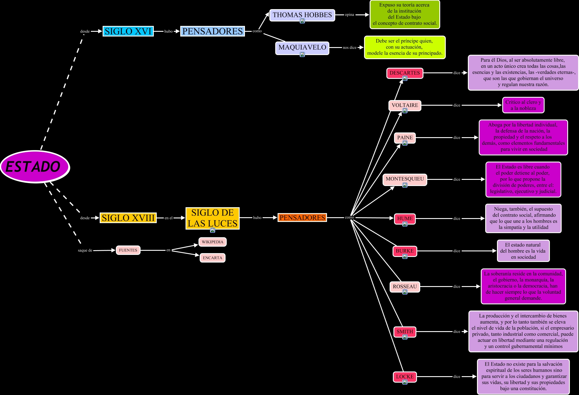 Este Cmap, tiene información relacionada con: EL estado en el transcurso del tiempo, ROSSEAU dice La soberanía reside en la comunidad, el gobierno, la monarquía, la aristocracia o la democracia, han de hacer siempre lo que la voluntad general demande., SMITH dice La producción y el intercambio de bienes aumenta, y por lo tanto también se eleva el nivel de vida de la población, si el empresario privado, tanto industrial como comercial, puede actuar en libertad mediante una regulación y un control gubernamental mínimos, DESCARTES dice Para él Dios, al ser absolutamente libre, en un acto único crea todas las cosas,las esencias y las existencias, las -verdades eternas-, que son las que gobiernan el universo y regulan nuestra razón., THOMAS HOBBES opina Expuso su teoría acerca de la institución del Estado bajo el concepto de contrato social., SIGLO XVI hubo PENSADORES, MONTESQUIEU dice El Estado es libre cuando el poder detiene al poder, por lo que propone la división de poderes, entre el: legislativo, ejecutivo y judicial., SIGLO XVIII en el SIGLO DE LAS LUCES, PAINE dice Aboga por la libertad individual, la defensa de la nación, la propiedad y el respeto a los demás, como elementos fundamentales para vivir en sociedad, LOCKE dice El Estado no existe para la salvación espiritual de los seres humanos sino para servir a los ciudadanos y garantizar sus vidas, su libertad y sus propiedades bajo una constitución., BURKE dice El estado natural del hombre es la vida en sociedad, ESTADO saque de FUENTES, MAQUIAVELO nos dice Debe ser el príncipe quien, con su actuación, modele la esencia de su principado., PENSADORES como SMITH, ESTADO desde SIGLO XVIII, PENSADORES como HUME, PENSADORES como THOMAS HOBBES, ESTADO desde SIGLO XVI, PENSADORES como MAQUIAVELO, FUENTES en WIKIPEDIA, PENSADORES como DESCARTES