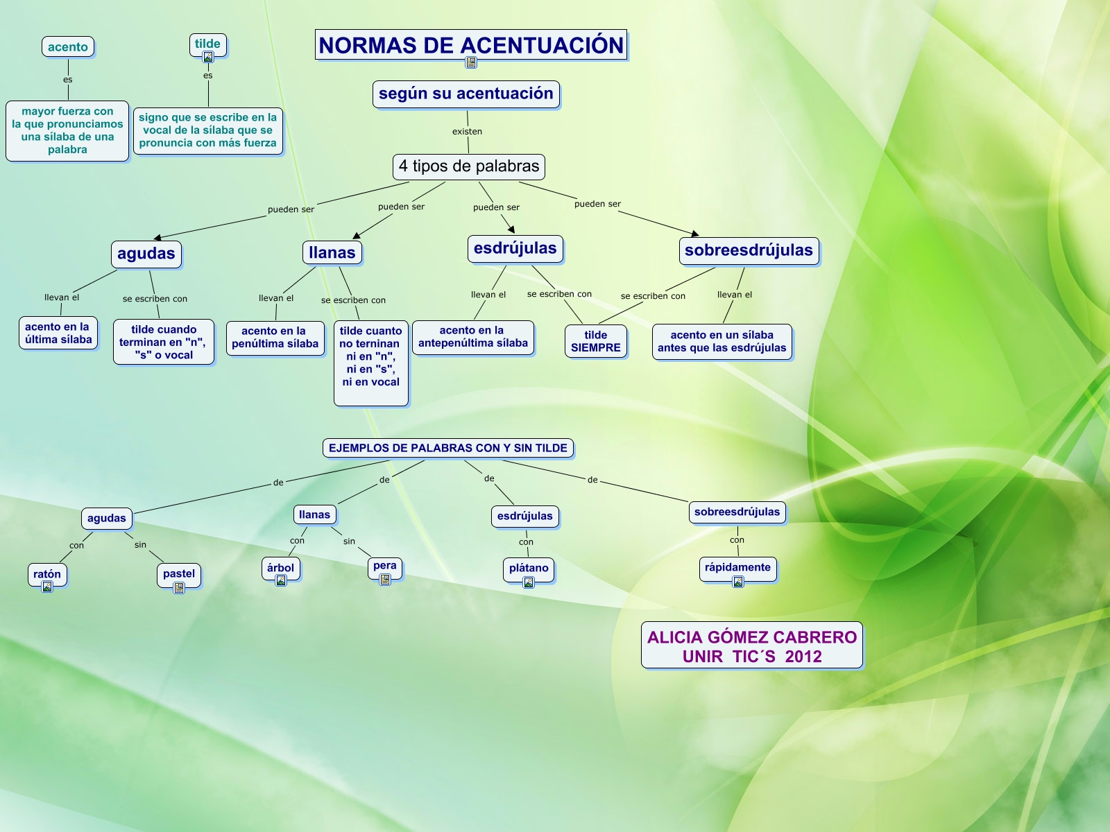 Este Cmap, tiene información relacionada con: Normas de acentuacion-Alicia Gomez Cabrero, tilde es signo que se escribe en la vocal de la sílaba que se pronuncia con más fuerza, esdrújulas llevan el acento en la antepenúltima sílaba, EJEMPLOS DE PALABRAS CON Y SIN TILDE de esdrújulas, 4 tipos de palabras pueden ser llanas, llanas con árbol, agudas con ratón, llanas se escriben con tilde cuanto no terninan ni en "n", ni en "s", ni en vocal, agudas se escriben con tilde cuando terminan en "n", "s" o vocal, sobreesdrújulas se escriben con tilde SIEMPRE, agudas sin pastel, 4 tipos de palabras pueden ser sobreesdrújulas, llanas sin pera, llanas llevan el acento en la penúltima sílaba, sobreesdrújulas llevan el acento en un sílaba antes que las esdrújulas, acento es mayor fuerza con la que pronunciamos una sílaba de una palabra, EJEMPLOS DE PALABRAS CON Y SIN TILDE de llanas, 4 tipos de palabras pueden ser esdrújulas, 4 tipos de palabras pueden ser agudas, sobreesdrújulas con rápidamente, EJEMPLOS DE PALABRAS CON Y SIN TILDE de agudas