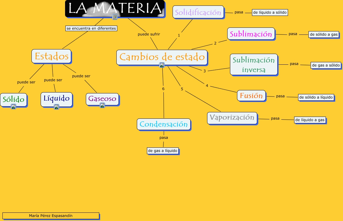 Este Cmap, tiene información relacionada con: Estado de la materia, Cambios de estado 1 Solidificación, Cambios de estado 2 Sublimación, Estados puede ser Gaseoso, Sublimación inversa pasa de gas a sólido, Condensación pasa de gas a líquido, LA MATERIA puede sufrir Cambios de estado, Estados puede ser Líquido, Cambios de estado 5 Vaporización, Vaporización pasa de líquido a gas, Cambios de estado 4 Fusión, Fusión pasa de sólido a líquido, LA MATERIA Estados, Cambios de estado 3 Sublimación inversa, Sublimación pasa de sólido a gas, Cambios de estado 6 Condensación, Estados puede ser Sólido, Solidificación pasa de líquido a sólido
