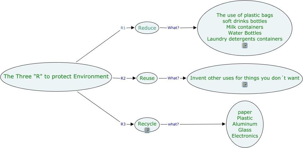 Este Cmap, tiene información relacionada con: recycling, Reuse What? Invent other uses for things you don´t want, Reduce What? The use of plastic bags soft drinks bottles Milk containers Water Bottles Laundry detergents containers, The Three "R" to protect Environment R2 Reuse, The Three "R" to protect Environment R3 Recycle, The Three "R" to protect Environment R1 Reduce, Recycle what? paper Plastic Aluminum Glass Electronics