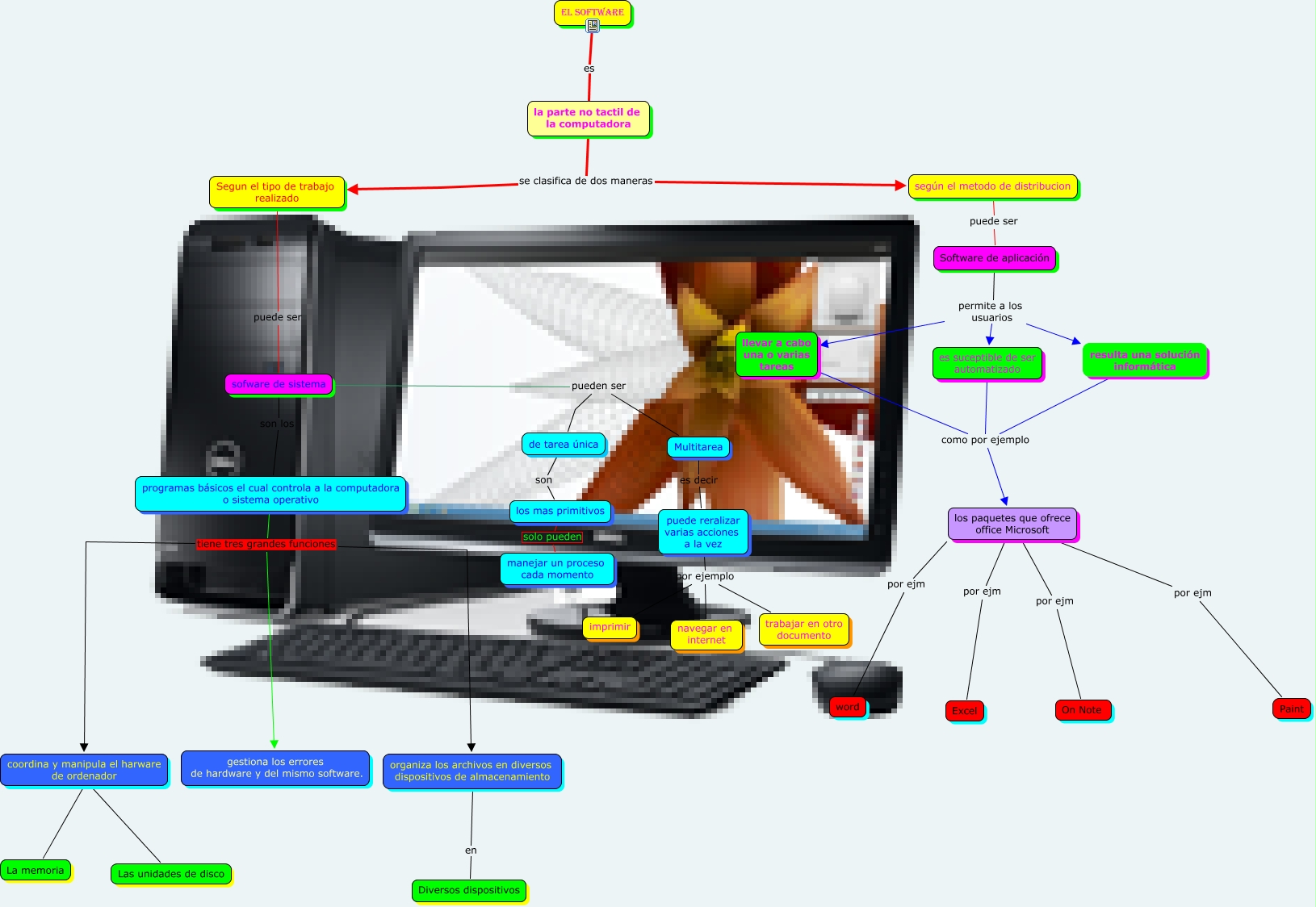 Este Cmap, tiene información relacionada con: software, coordina y manipula el harware de ordenador como La memoria, Software de aplicación permite a los usuarios resulta una solución informática, sofware de sistema son los programas básicos el cual controla a la computadora o sistema operativo, programas básicos el cual controla a la computadora o sistema operativo tiene tres grandes funciones gestiona los errores de hardware y del mismo software., Multitarea es decir puede reralizar varias acciones a la vez, la parte no tactil de la computadora se clasifica de dos maneras Segun el tipo de trabajo realizado, llevar a cabo una o varias tareas como por ejemplo los paquetes que ofrece office Microsoft, organiza los archivos en diversos dispositivos de almacenamiento en Diversos dispositivos, llevar a cabo una o varias tareas como por ejemplo resulta una solución informática, de tarea única son los mas primitivos, El Software es la parte no tactil de la computadora, Software de aplicación permite a los usuarios es suceptible de ser automatizado, sofware de sistema pueden ser de tarea única, los paquetes que ofrece office Microsoft por ejm On Note, puede reralizar varias acciones a la vez por ejemplo trabajar en otro documento, puede reralizar varias acciones a la vez por ejemplo navegar en internet, llevar a cabo una o varias tareas como por ejemplo es suceptible de ser automatizado, los mas primitivos solo pueden manejar un proceso cada momento, los paquetes que ofrece office Microsoft por ejm Excel, la parte no tactil de la computadora se clasifica de dos maneras según el metodo de distribucion