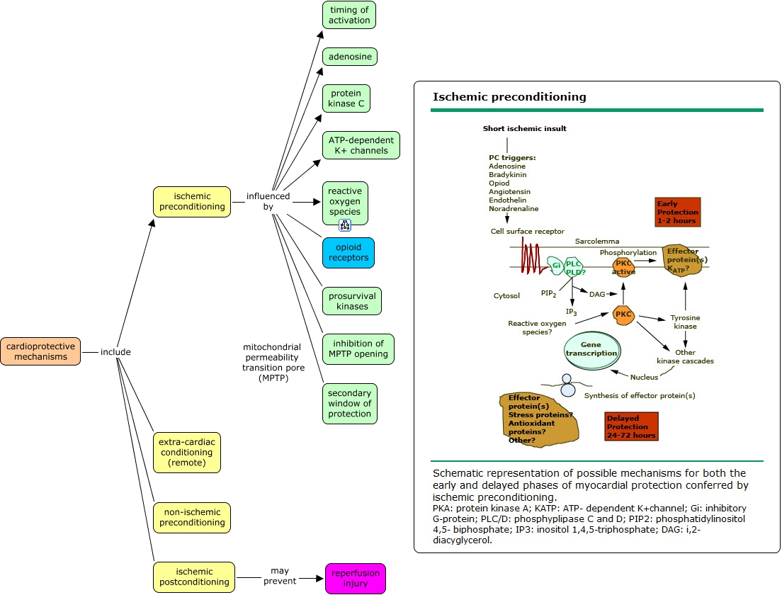 This Concept Map, created with IHMC CmapTools, has information related to: ischemia, cardioprotective mechanisms include non-ischemic preconditioning, cardioprotective mechanisms include ischemic preconditioning, cardioprotective mechanisms include ischemic postconditioning, ischemic preconditioning influenced by secondary window of protection, ischemic preconditioning influenced by ATP-dependent K+ channels, ischemic preconditioning influenced by timing of activation, ischemic postconditioning may prevent reperfusion injury, ischemic preconditioning influenced by inhibition of MPTP opening, ischemic preconditioning influenced by reactive oxygen species, ischemic preconditioning influenced by adenosine, ischemic preconditioning influenced by opioid receptors, ischemic preconditioning influenced by protein kinase C, ischemic preconditioning influenced by prosurvival kinases, cardioprotective mechanisms include extra-cardiac conditioning (remote)