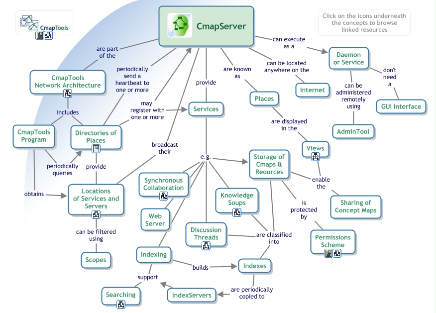 Este Cmap, tiene información relacionada con: CmapTools - CmapServer, CmapTools Network Architecture includes Directories of Places, Daemon or Service don't need a GUI Interface, IndexServers support Searching, Services e.g. Knowledge Soups, Services e.g. Storage of Cmaps & Reources, CmapTools Network Architecture includes CmapTools Program, Directories of Places may register with one or more Services, Services e.g. Discussion Threads, Views enable the Sharing of Concept Maps, Services e.g. Synchronous Collaboration, CmapTools CmapServers can execute as a Daemon or Service, CmapTools CmapServers provide Services, Indexes are periodically copied to IndexServers, CmapTools CmapServers broadcast their Locations of Services and Servers, CmapTools CmapServers are known as Places, CmapTools Program obtains Locations of Services and Servers, Directories of Places provide Locations of Services and Servers, Places are displayed in the Views, Daemon or Service can be administered remotely using AdminTool, Indexing support Searching