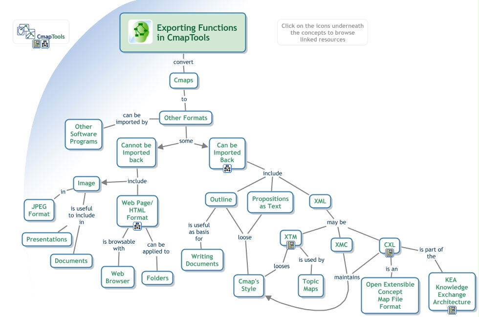Este Cmap, tiene información relacionada con: CmapTools - Exporting Cmaps, Image is useful to include in Presentations, XTM is used by Topic Maps, Image in JPEG Format, Can be Imported Back include Propositions as Text, Web Page/ HTML Format can be applied to Folders, XML may be XTM, Other Formats some Cannot be Imported back, Web Page/ HTML Format is browsable with Web Browser, Other Formats some Can be Imported Back, XML may be XMC, CXL maintains Cmap's Style, Image is useful to include in Documents, Outline loose Cmap's Style, XTM looses Cmap's Style, Exporting Funcitons in CmapTools convert Cmaps, Other Formats can be imported by Other Software Programs, CXL is part of the KEA Knowledge Exchange Architecture, CXL is an Open Extensible Concept Map File Format, Outline is useful as basis for Writing Documents, Cannot be Imported back include Web Page/ HTML Format