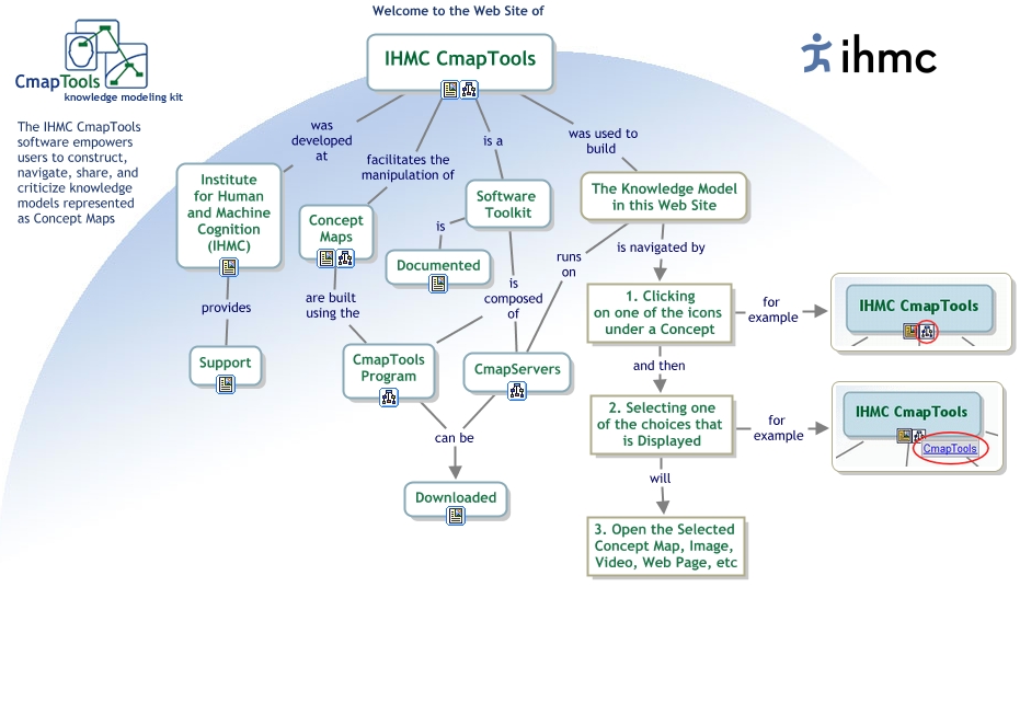 This Concept Map, created with IHMC CmapTools, has information related to: CmapTools - Home Page Cmap, CmapTools Program can be Downloaded, The Knowledge Model in this Web Site is navigated by 1. Clicking on one of the icons under a Concept, Institute for Human and Machine Cognition (IHMC) provides Support, Software Toolkit is composed of CmapTools Program, 1. Clicking on one of the icons under a Concept and then 2. Selecting one of the choices that is Displayed, The Knowledge Model in this Web Site runs on CmapServers, CmapServers can be Downloaded, IHMC CmapTools is a Software Toolkit, Software Toolkit is Documented, Software Toolkit is composed of CmapServers, IHMC CmapTools was used to build The Knowledge Model in this Web Site, IHMC CmapTools facilitates the manipulation of Concept Maps, 1. Clicking on one of the icons under a Concept for example, Concept Maps are built using the CmapTools Program, 2. Selecting one of the choices that is Displayed for example, 2. Selecting one of the choices that is Displayed will 3. Open the Selected Concept Map, Image, Video, Web Page, etc, IHMC CmapTools was developed at Institute for Human and Machine Cognition (IHMC)