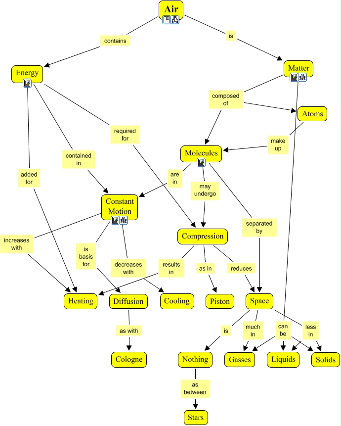 This Concept Map, created with IHMC CmapTools, has information related to: AIR PUSHES FROM A BALLOON, Molecules separated by Space, Nothing as between Stars, Constant Motion increases with Heating, Space less in Solids, Molecules are in Constant Motion, Space much in Gasses, Compression results in Heating, Energy required for Compression, Space is Nothing, Matter composed of Molecules, Energy added for Heating, Matter can be Liquids, Matter can be Gasses, Air is Matter, Compression reduces Space, Constant Motion is basis for Diffusion, Air contains Energy, Space less in Liquids, Compression as in Piston, Matter composed of Atoms