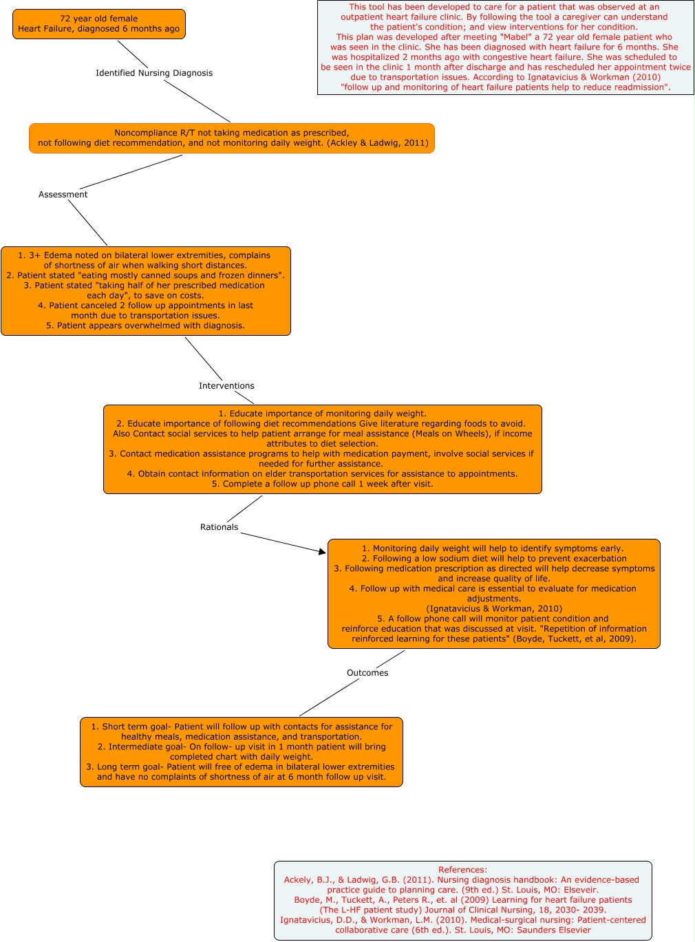 This Concept Map, created with IHMC CmapTools, has information related to: Chronic_Heart Failure, 1. Educate importance of monitoring daily weight. 2. Educate importance of following diet recommendations Give literature regarding foods to avoid. Also Contact social services to help patient arrange for meal assistance (Meals on Wheels), if income attributes to diet selection. 3. Contact medication assistance programs to help with medication payment, involve social services if needed for further assistance. 4. Obtain contact information on elder transportation services for assistance to appointments. 5. Complete a follow up phone call 1 week after visit. Rationals 1. Monitoring daily weight will help to identify symptoms early. 2. Following a low sodium diet will help to prevent exacerbation 3. Following medication prescription as directed will help decrease symptoms and increase quality of life. 4. Follow up with medical care is essential to evaluate for medication adjustments. (Ignatavicius & Workman, 2010) 5. A follow phone call will monitor patient condition and reinforce education that was discussed at visit. "Repetition of information reinforced learning for these patients" (Boyde, Tuckett, et al, 2009)., 1. 3+ Edema noted on bilateral lower extremities, complains of shortness of air when walking short distances. 2. Patient stated "eating mostly canned soups and frozen dinners". 3. Patient stated "taking half of her prescribed medication each day", to save on costs. 4. Patient canceled 2 follow up appointments in last month due to transportation issues. 5. Patient appears overwhelmed with diagnosis. Interventions 1. Educate importance of monitoring daily weight. 2. Educate importance of following diet recommendations Give literature regarding foods to avoid. Also Contact social services to help patient arrange for meal assistance (Meals on Wheels), if income attributes to diet selection. 3. Contact medication assistance programs to help with medication payment, involve social services if needed for further assistance. 4. Obtain contact information on elder transportation services for assistance to appointments. 5. Complete a follow up phone call 1 week after visit., 72 year old female Heart Failure, diagnosed 6 months ago Identified Nursing Diagnosis Noncompliance R/T not taking medication as prescribed, not following diet recommendation, and not monitoring daily weight. (Ackley & Ladwig, 2011), 1. Monitoring daily weight will help to identify symptoms early. 2. Following a low sodium diet will help to prevent exacerbation 3. Following medication prescription as directed will help decrease symptoms and increase quality of life. 4. Follow up with medical care is essential to evaluate for medication adjustments. (Ignatavicius & Workman, 2010) 5. A follow phone call will monitor patient condition and reinforce education that was discussed at visit. "Repetition of information reinforced learning for these patients" (Boyde, Tuckett, et al, 2009). Outcomes 1. Short term goal- Patient will follow up with contacts for assistance for healthy meals, medication assistance, and transportation. 2. Intermediate goal- On follow- up visit in 1 month patient will bring completed chart with daily weight. 3. Long term goal- Patient will free of edema in bilateral lower extremities and have no complaints of shortness of air at 6 month follow up visit., Noncompliance R/T not taking medication as prescribed, not following diet recommendation, and not monitoring daily weight. (Ackley & Ladwig, 2011) Assessment 1. 3+ Edema noted on bilateral lower extremities, complains of shortness of air when walking short distances. 2. Patient stated "eating mostly canned soups and frozen dinners". 3. Patient stated "taking half of her prescribed medication each day", to save on costs. 4. Patient canceled 2 follow up appointments in last month due to transportation issues. 5. Patient appears overwhelmed with diagnosis.