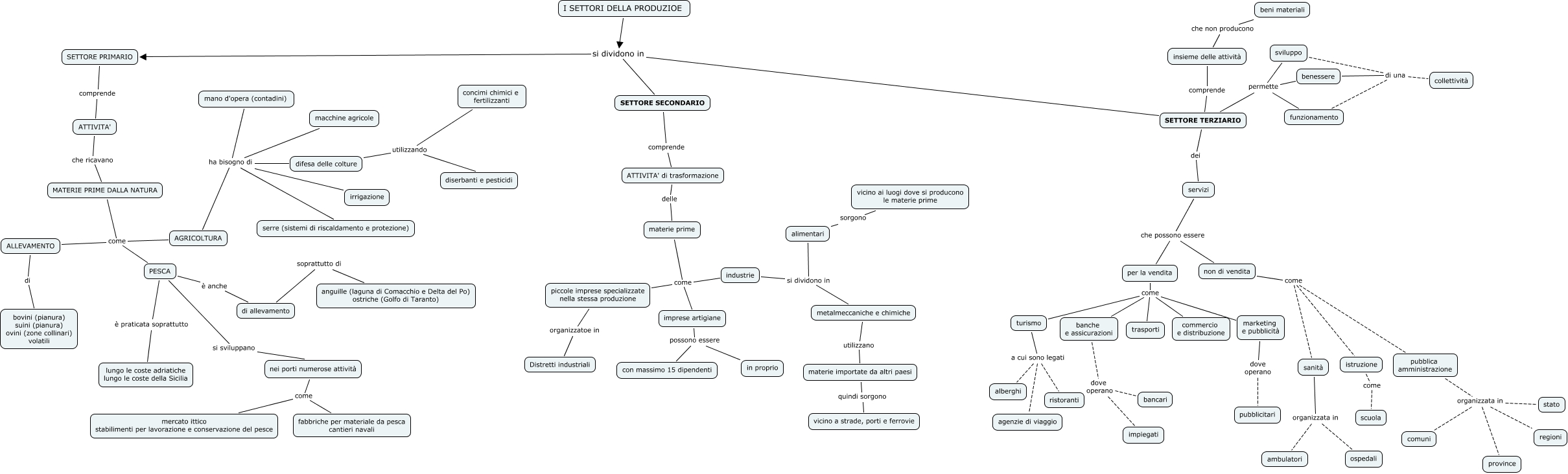 Questa Cmap, creata con IHMC CmapTools, contiene informazioni relative a: SETTORI economici, materie prime come piccole imprese specializzate nella stessa produzione, piccole imprese specializzate nella stessa produzione organizzatoe in Distretti industriali, materie prime come imprese artigiane, per la vendita come trasporti, AGRICOLTURA ha bisogno di macchine agricole, banche e assicurazioni dove operano bancari, nei porti numerose attività come mercato ittico stabilimenti per lavorazione e conservazione del pesce, pubblica amministrazione organizzata in stato, AGRICOLTURA ha bisogno di difesa delle colture, sanità organizzata in ambulatori, PESCA è anche di allevamento, turismo a cui sono legati ristoranti, industrie si dividono in metalmeccaniche e chimiche, servizi che possono essere per la vendita, per la vendita come marketing e pubblicità, MATERIE PRIME DALLA NATURA come ALLEVAMENTO, AGRICOLTURA ha bisogno di serre (sistemi di riscaldamento e protezione), imprese artigiane possono essere con massimo 15 dipendenti, turismo a cui sono legati alberghi, SETTORE TERZIARIO permette sviluppo