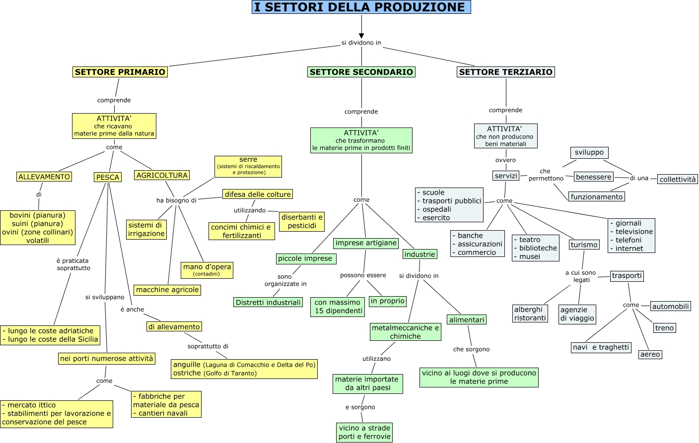 Questa Cmap, creata con IHMC CmapTools, contiene informazioni relative a: SETTORI economici1, AGRICOLTURA ha bisogno di serre (sistemi di riscaldamento e protezione), servizi che permettono benessere, servizi che permettono sviluppo, ATTIVITA' che non producono beni materiali ovvero servizi, ATTIVITA' che ricavano materie prime dalla natura come AGRICOLTURA, funzionamento di una collettività, ATTIVITA' che trasformano le materie prime in prodotti finiti come imprese artigiane, imprese artigiane possono essere in proprio, SETTORE TERZIARIO comprende ATTIVITA' che non producono beni materiali, AGRICOLTURA ha bisogno di mano d'opera (contadini), AGRICOLTURA ha bisogno di difesa delle colture, ATTIVITA' che ricavano materie prime dalla natura come PESCA, SETTORE SECONDARIO comprende ATTIVITA' che trasformano le materie prime in prodotti finiti, trasporti come aereo, I SETTORI DELLA PRODUZIONE si dividono in SETTORE PRIMARIO, nei porti numerose attività come - mercato ittico - stabilimenti per lavorazione e conservazione del pesce, industrie si dividono in metalmeccaniche e chimiche, materie importate da altri paesi e sorgono vicino a strade porti e ferrovie, sviluppo di una collettività, imprese artigiane possono essere con massimo 15 dipendenti