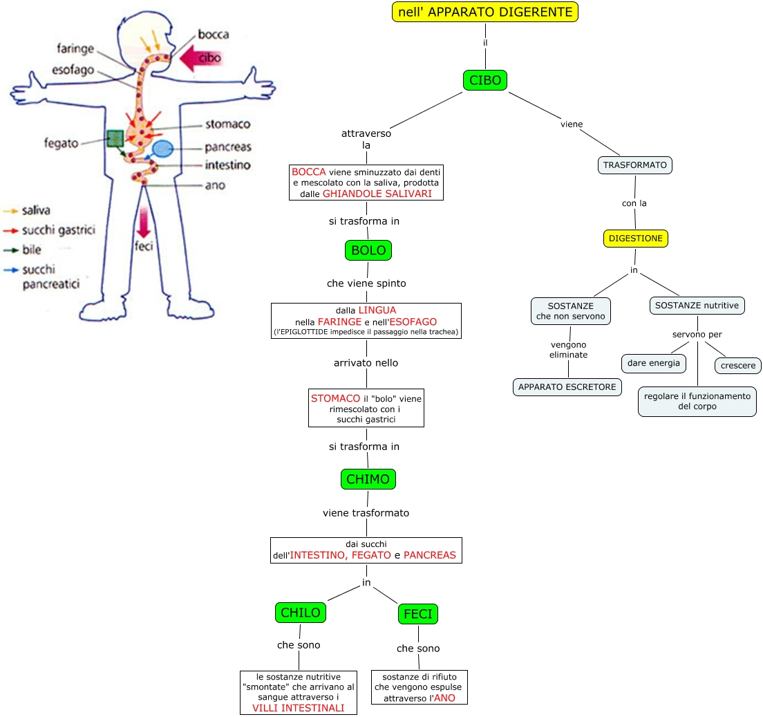 Questa Cmap, creata con IHMC CmapTools, contiene informazioni relative a: apparato digerente - matteo, SOSTANZE nutritive servono per dare energia, STOMACO il "bolo" viene rimescolato con i succhi gastrici si trasforma in CHIMO, DIGESTIONE in SOSTANZE nutritive, TRASFORMATO con la DIGESTIONE, SOSTANZE nutritive servono per crescere, FECI che sono sostanze di rifiuto che vengono espulse attraverso l'ANO, CHIMO viene trasformato dai succhi dell'INTESTINO, FEGATO e PANCREAS, BOCCA viene sminuzzato dai denti e mescolato con la saliva, prodotta dalle GHIANDOLE SALIVARI si trasforma in BOLO, BOLO che viene spinto dalla LINGUA nella FARINGE e nell'ESOFAGO (l'EPIGLOTTIDE impedisce il passaggio nella trachea), CIBO viene TRASFORMATO, DIGESTIONE in SOSTANZE che non servono, CHILO che sono le sostanze nutritive "smontate" che arrivano al sangue attraverso i VILLI INTESTINALI, dai succhi dell'INTESTINO, FEGATO e PANCREAS in FECI, SOSTANZE nutritive servono per regolare il funzionamento del corpo, dai succhi dell'INTESTINO, FEGATO e PANCREAS in CHILO, SOSTANZE che non servono vengono eliminate APPARATO ESCRETORE, nell' APPARATO DIGERENTE il CIBO, CIBO attraverso la BOCCA viene sminuzzato dai denti e mescolato con la saliva, prodotta dalle GHIANDOLE SALIVARI, dalla LINGUA nella FARINGE e nell'ESOFAGO (l'EPIGLOTTIDE impedisce il passaggio nella trachea) arrivato nello STOMACO il "bolo" viene rimescolato con i succhi gastrici