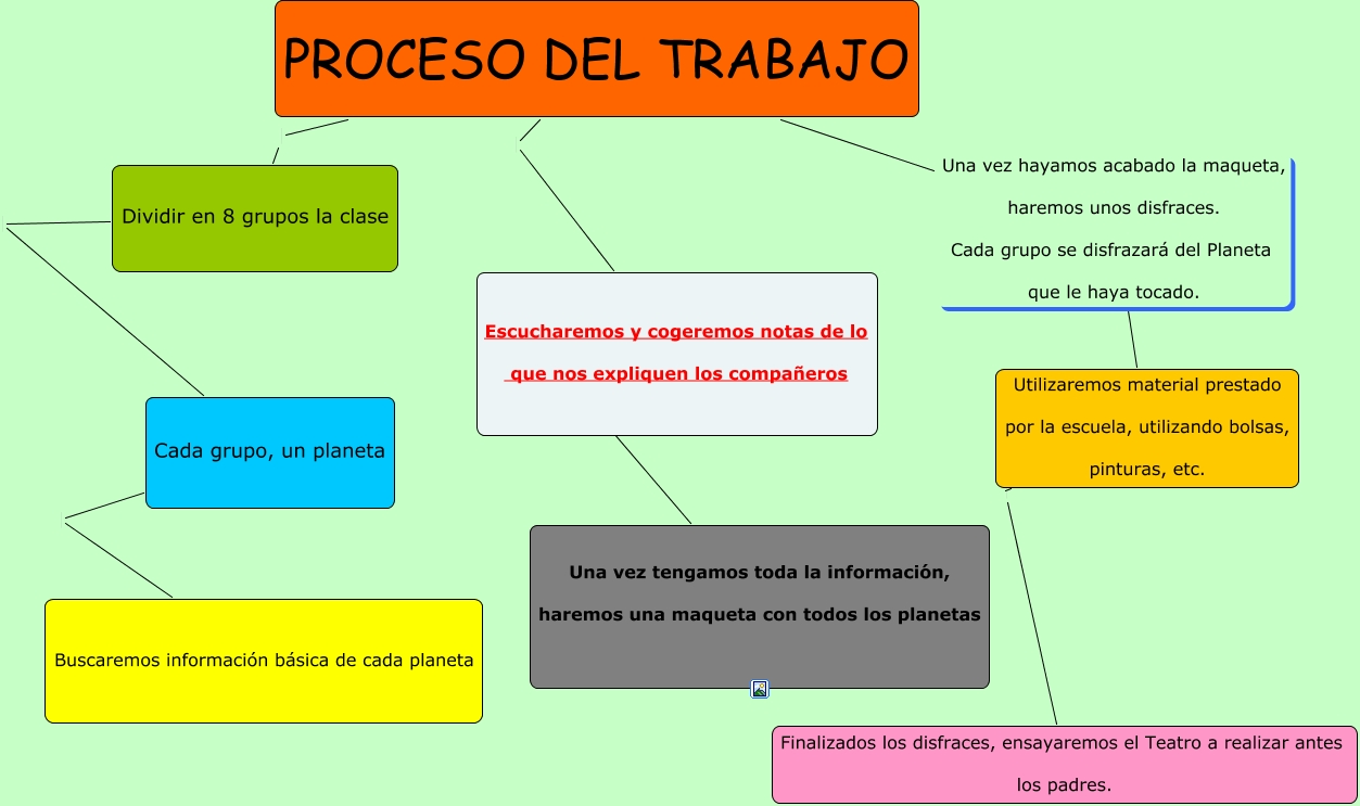 Este Cmap, tiene información relacionada con: PROCESO webquest sistema solar, PROCESO DEL TRABAJO Dividir en 8 grupos la clase, PROCESO DEL TRABAJO Escucharemos y cogeremos notas de lo que nos expliquen los compañeros, Dividir en 8 grupos la clase Cada grupo, un planeta, Escucharemos y cogeremos notas de lo que nos expliquen los compañeros Una vez tengamos toda la información, haremos una maqueta con todos los planetas, Cada grupo, un planeta Buscaremos información básica de cada planeta, PROCESO DEL TRABAJO Una vez hayamos acabado la maqueta, haremos unos disfraces. Cada grupo se disfrazará del Planeta que le haya tocado. Utilizaremos material prestado por la escuela, utilizando bolsas, pinturas, etc., Utilizaremos material prestado por la escuela, utilizando bolsas, pinturas, etc. Finalizados los disfraces, ensayaremos el Teatro a realizar antes los padres.