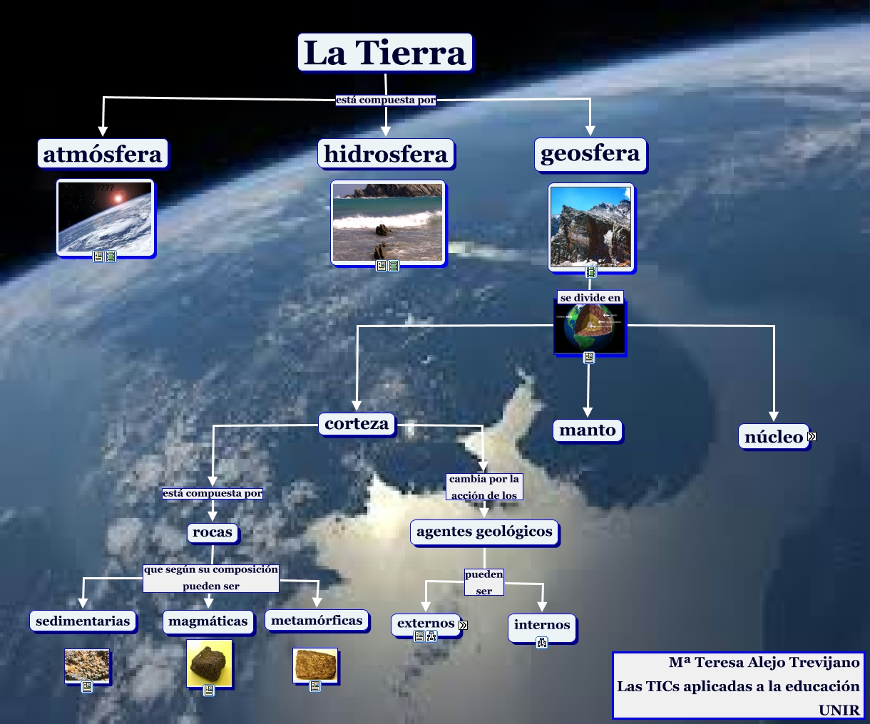 Este Cmap, tiene información relacionada con: La Tierra, núcleo, manto, corteza, agentes geológicos pueden ser externos, La Tierra está compuesta por atmósfera, rocas que según su composición pueden ser sedimentarias, rocas que según su composición pueden ser metamórficas, corteza está compuesta por rocas, corteza cambia por la acción de los agentes geológicos, La Tierra está compuesta por geosfera, La Tierra está compuesta por hidrosfera, agentes geológicos pueden ser internos, rocas que según su composición pueden ser magmáticas