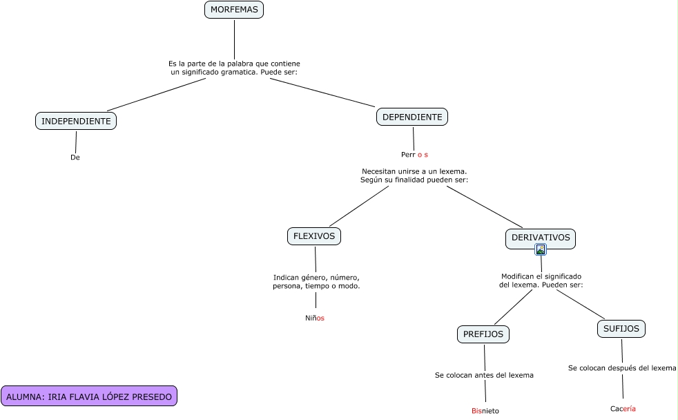Este Cmap, tiene información relacionada con: Sin Título 3, SUFIJOS Se colocan después del lexema Cacería, INDEPENDIENTE De, FLEXIVOS Indican género, número, persona, tiempo o modo. Niños, MORFEMAS Es la parte de la palabra que contiene un significado gramatica. Puede ser: DEPENDIENTE, PREFIJOS Se colocan antes del lexema Bisnieto, DERIVATIVOS Modifican el significado del lexema. Pueden ser: SUFIJOS, DERIVATIVOS Modifican el significado del lexema. Pueden ser: PREFIJOS, DEPENDIENTE Perr o s Necesitan unirse a un lexema. Según su finalidad pueden ser: DERIVATIVOS, DEPENDIENTE Perr o s Necesitan unirse a un lexema. Según su finalidad pueden ser:, DEPENDIENTE Perr o s Necesitan unirse a un lexema. Según su finalidad pueden ser: FLEXIVOS, MORFEMAS Es la parte de la palabra que contiene un significado gramatica. Puede ser: INDEPENDIENTE