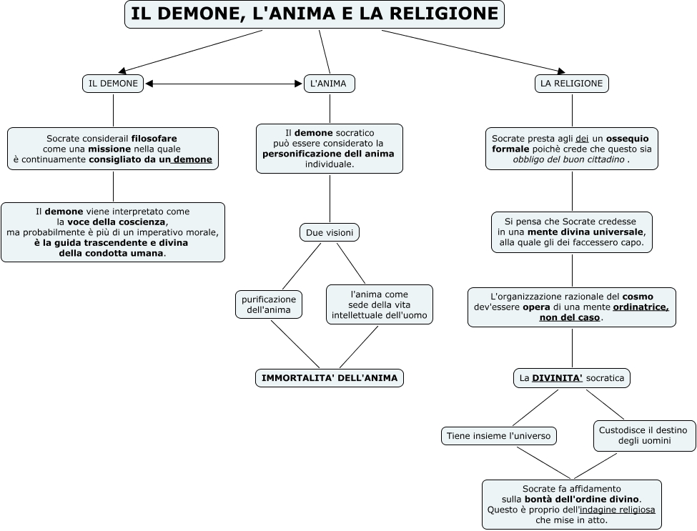 Questa Cmap, creata con IHMC CmapTools, contiene informazioni relative a: Cmap Socrate demone anima e religione, L'ANIMA IL DEMONE, IL DEMONE Socrate considerail filosofare come una missione nella quale è continuamente consigliato da un demone, Custodisce il destino degli uomini Socrate fa affidamento sulla bontà dell'ordine divino. Questo è proprio dell'indagine religiosa che mise in atto., LA RELIGIONE Socrate presta agli dei un ossequio formale poichè crede che questo sia obbligo del buon cittadino., Si pensa che Socrate credesse in una mente divina universale, alla quale gli dei faccessero capo. L'organizzazione razionale del cosmo dev'essere opera di una mente ordinatrice, non del caso., Il demone socratico può essere considerato la personificazione dell anima individuale. Due visioni, Socrate presta agli dei un ossequio formale poichè crede che questo sia obbligo del buon cittadino. Si pensa che Socrate credesse in una mente divina universale, alla quale gli dei faccessero capo., Socrate considerail filosofare come una missione nella quale è continuamente consigliato da un demone Il demone viene interpretato come la voce della coscienza, ma probabilmente è più di un imperativo morale, è la guida trascendente e divina della condotta umana., Tiene insieme l'universo Socrate fa affidamento sulla bontà dell'ordine divino. Questo è proprio dell'indagine religiosa che mise in atto., IMMORTALITA' DELL'ANIMA purificazione dell'anima, IL DEMONE, L'ANIMA E LA RELIGIONE LA RELIGIONE, L'ANIMA Il demone socratico può essere considerato la personificazione dell anima individuale., IL DEMONE, L'ANIMA E LA RELIGIONE L'ANIMA, La DIVINITA' socratica Custodisce il destino degli uomini, IMMORTALITA' DELL'ANIMA l'anima come sede della vita intellettuale dell'uomo, IL DEMONE, L'ANIMA E LA RELIGIONE IL DEMONE, La DIVINITA' socratica Tiene insieme l'universo, Due visioni l'anima come sede della vita intellettuale dell'uomo, Due visioni purificazione dell'anima, L'organizzazione razionale del cosmo dev'essere opera di una mente ordinatrice, non del caso. La DIVINITA' socratica