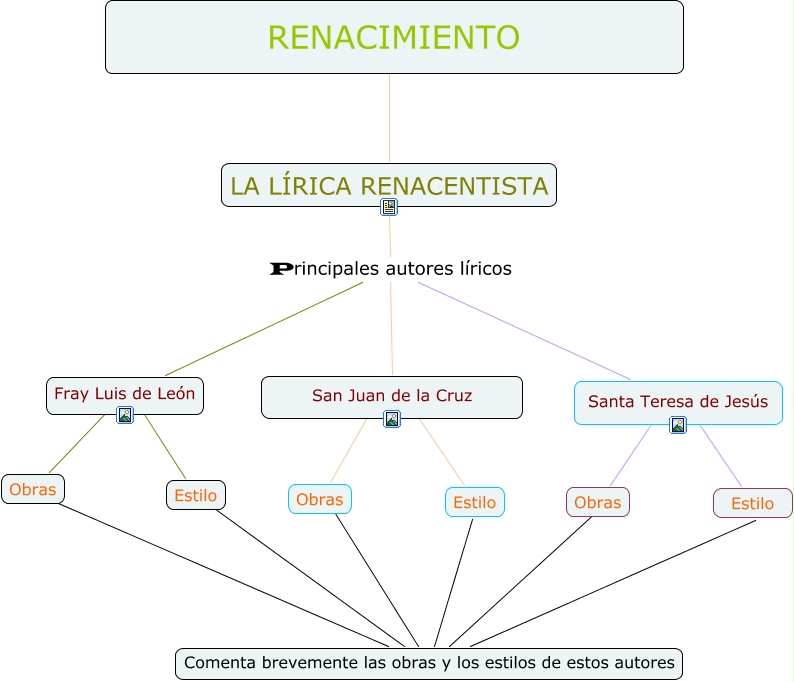 Este Cmap, tiene información relacionada con: Lírica, LA LÍRICA RENACENTISTA Principales autores líricos San Juan de la Cruz, Obras ???? Comenta brevemente las obras y los estilos de estos autores, LA LÍRICA RENACENTISTA Principales autores líricos Santa Teresa de Jesús, Estilo ???? Comenta brevemente las obras y los estilos de estos autores, LA LÍRICA RENACENTISTA Principales autores líricos Fray Luis de León, Santa Teresa de Jesús ???? Estilo, Fray Luis de León ???? Estilo, RENACIMIENTO ???? LA LÍRICA RENACENTISTA, Estilo ???? Comenta brevemente las obras y los estilos de estos autores, San Juan de la Cruz ???? Obras, Fray Luis de León ???? Obras, San Juan de la Cruz ???? Estilo, Estilo ???? Comenta brevemente las obras y los estilos de estos autores, Obras ???? Comenta brevemente las obras y los estilos de estos autores, Santa Teresa de Jesús ???? Obras, Obras ???? Comenta brevemente las obras y los estilos de estos autores