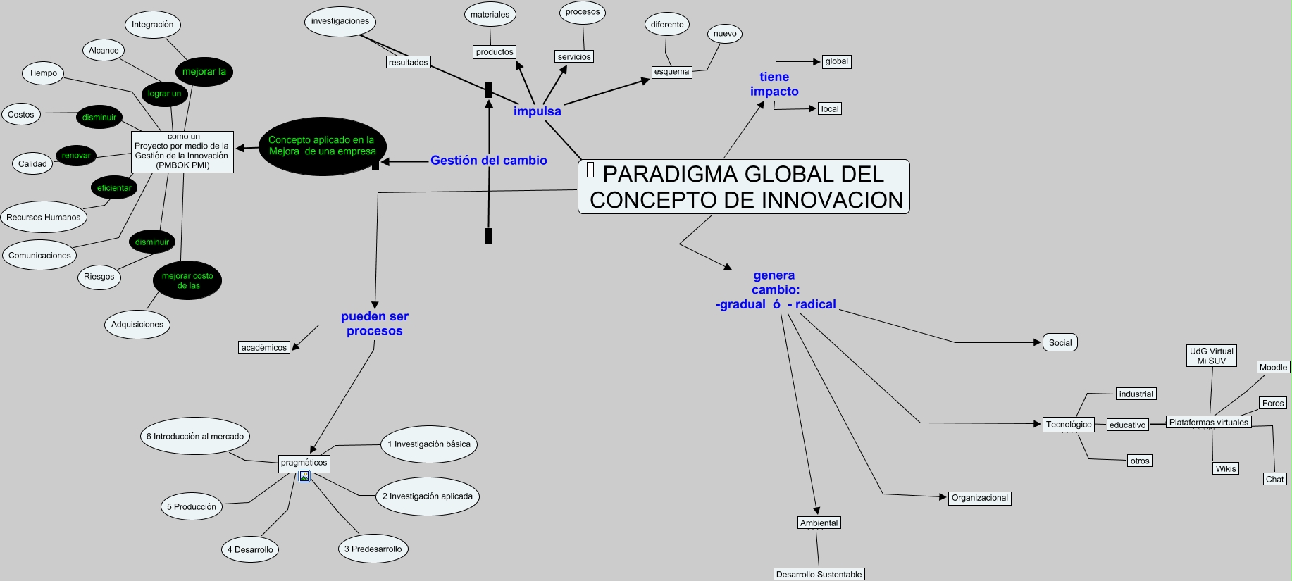 Este Cmap, tiene información relacionada con: Enfoque global y multidisciplinario de la innovación y algunos ejemplos, como un Proyecto por medio de la Gestión de la Innovación (PMBOK PMI) ???? Integración, resultados ???? investigaciones, impulsa ????, Tecnológico ???? educativo, PARADIGMA GLOBAL DEL CONCEPTO DE INNOVACION pueden ser procesos pragmáticos, pragmáticos ???? 5 Producción, Tecnológico ???? otros, Plataformas virtuales ???? UdG Virtual Mi SUV, PARADIGMA GLOBAL DEL CONCEPTO DE INNOVACION genera cambio: -gradual ó - radical Social, Ambiental ???? Desarrollo Sustentable, como un Proyecto por medio de la Gestión de la Innovación (PMBOK PMI) ???? Adquisiciones, PARADIGMA GLOBAL DEL CONCEPTO DE INNOVACION pueden ser procesos académicos, impulsa esquema, pragmáticos ???? 4 Desarrollo, PARADIGMA GLOBAL DEL CONCEPTO DE INNOVACION genera cambio: -gradual ó - radical Organizacional, como un Proyecto por medio de la Gestión de la Innovación (PMBOK PMI) ???? Recursos Humanos, Gestión del cambio, Plataformas virtuales ???? Moodle, pragmáticos ???? 2 Investigación aplicada, como un Proyecto por medio de la Gestión de la Innovación (PMBOK PMI) ???? Comunicaciones