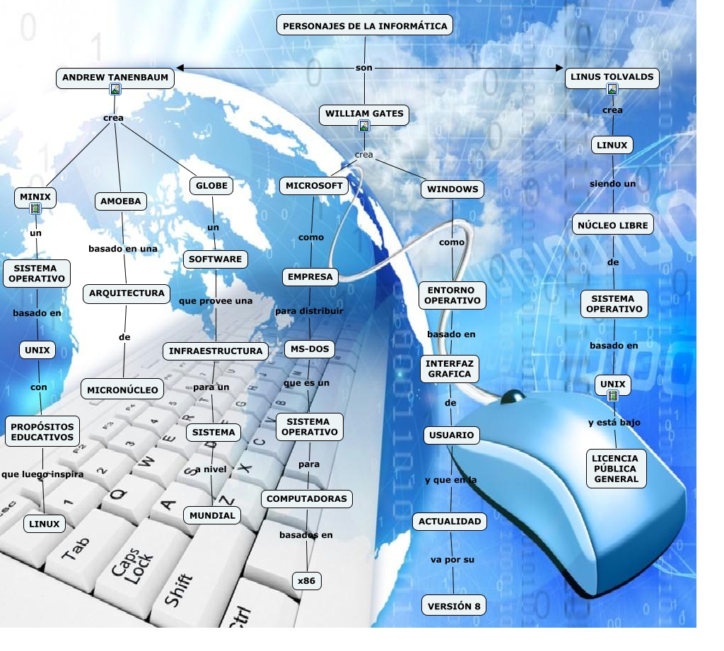 Este Cmap, tiene información relacionada con: Personajes de la Informatica, UNIX con PROPÓSITOS EDUCATIVOS, GLOBE un SOFTWARE, SISTEMA OPERATIVO basado en UNIX, ENTORNO OPERATIVO basado en INTERFAZ GRAFICA, WILLIAM GATES crea MICROSOFT, INFRAESTRUCTURA para un SISTEMA, COMPUTADORAS basados en x86, ANDREW TANENBAUM crea GLOBE, PERSONAJES DE LA INFORMÁTICA son ANDREW TANENBAUM, PERSONAJES DE LA INFORMÁTICA son LINUS TOLVALDS, ANDREW TANENBAUM crea MINIX, ACTUALIDAD va por su VERSIÓN 8, LINUX siendo un NÚCLEO LIBRE, WILLIAM GATES crea WINDOWS, EMPRESA para distribuir MS-DOS, USUARIO y que en la ACTUALIDAD, MINIX un SISTEMA OPERATIVO, NÚCLEO LIBRE de SISTEMA OPERATIVO, SISTEMA OPERATIVO para COMPUTADORAS, WINDOWS como ENTORNO OPERATIVO
