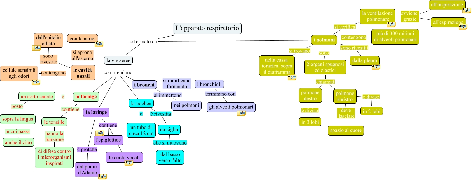 Questa Cmap, creata con IHMC CmapTools, contiene informazioni relative a: l'apparato respiratorio, i polmoni sono 2 organi spugnosi ed elastici, L'apparato respiratorio è formato da i polmoni, i bronchi si ramificano formando i bronchioli, la faringe è un corto canale, i polmoni si verifica la ventilazione polmonare, 2 organi spugnosi ed elastici chiamati polmone destro, la laringe contiene le corde vocali, sopra la lingua in cui passa anche il cibo, i polmoni si trovano nella cassa toracica, sopra il diaframma, la ventilazione polmonare avviene grazie all'inspirazione, L'apparato respiratorio è formato da la vie aeree, polmone sinistro deve lasciare spazio al cuore, la trachea è un tubo di circa 12 cm, polmone destro è diviso in 3 lobi, i bronchioli terminano con gli alveoli polmonari, i bronchi si immettono nei polmoni, la faringe contiene le tonsille, la vie aeree comprendono la faringe, da ciglia che si muovono dal basso verso l'alto, la ventilazione polmonare avviene grazie all'espirazione