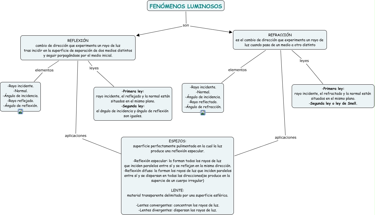 Este Cmap, tiene información relacionada con: FENÓMENOS LUMINOSOS, REFLEXIÓN cambio de dirección que experimenta un rayo de luz tras incidir en la superficie de separación de dos medios distintos y seguir porpagándose por el medio inicial. leyes -Primera ley: rayo incidente, el reflejado y la normal están situados en el mismo plano. -Segunda ley: el ángulo de incidencia y ángulo de reflexión son iguales., REFRACCIÓN es el cambio de dirección que experimenta un rayo de luz cuando pasa de un medio a otro distinto elementos -Rayo incidente. -Normal. -Ángulo de incidencia. -Rayo reflectado. -Ángulo de refracción., FENÓMENOS LUMINOSOS son REFLEXIÓN cambio de dirección que experimenta un rayo de luz tras incidir en la superficie de separación de dos medios distintos y seguir porpagándose por el medio inicial., REFLEXIÓN cambio de dirección que experimenta un rayo de luz tras incidir en la superficie de separación de dos medios distintos y seguir porpagándose por el medio inicial. elementos -Rayo incidente. -Normal. -Ángulo de incidencia. -Rayo reflejado. -Ángulo de reflexión., REFRACCIÓN es el cambio de dirección que experimenta un rayo de luz cuando pasa de un medio a otro distinto leyes -Primera ley: rayo incidente, el refractado y la normal están situados en el mismo plano. -Segunda ley o ley de Snell., FENÓMENOS LUMINOSOS son REFRACCIÓN es el cambio de dirección que experimenta un rayo de luz cuando pasa de un medio a otro distinto, REFRACCIÓN es el cambio de dirección que experimenta un rayo de luz cuando pasa de un medio a otro distinto aplicaciones ESPEJOS: superficie perfectamente pulimentada en la cual la luz produce una reflexión especular. -Reflexión especular: la forman todos los rayos de luz que inciden paralelos entre sí y se reflejan en la misma dirección. -Reflexión difusa: la forman los rayos de luz que inciden paralelos entre sí y se dispersan en todas las direcciones(se produce en la supercie de un cuerpo irregular) LENTE: material transparente delimitado por una superficie esférica. -Lentes convergentes: concentran los rayos de luz. -Lentes divergentes: dispersan los rayos de luz., REFLEXIÓN cambio de dirección que experimenta un rayo de luz tras incidir en la superficie de separación de dos medios distintos y seguir porpagándose por el medio inicial. aplicaciones ????