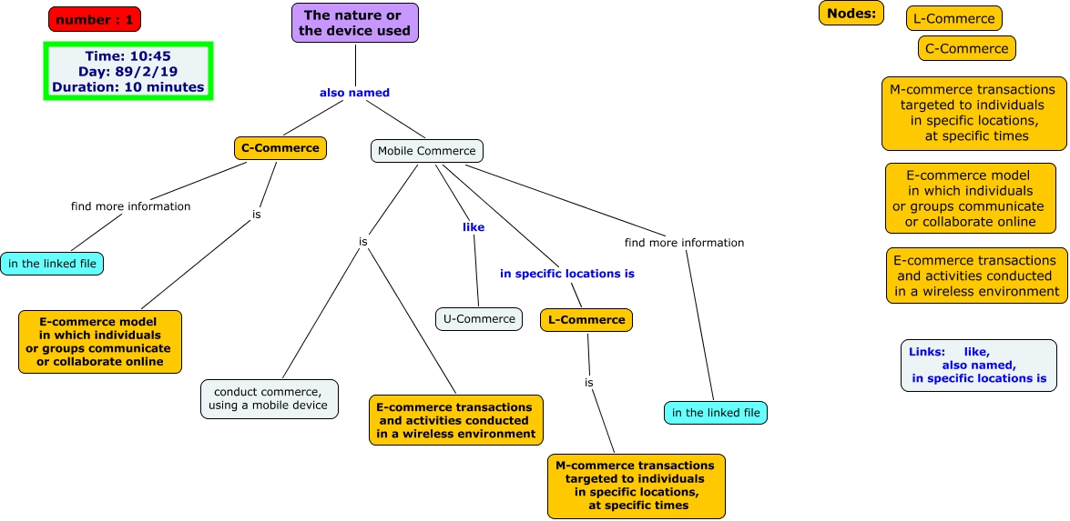 This Concept Map, created with IHMC CmapTools, has information related to: EC categories by the nature or the device used, Mobile Commerce in specific locations is L-Commerce, Mobile Commerce find more information in the linked file, Mobile Commerce like U-Commerce, C-Commerce is E-commerce model in which individuals or groups communicate or collaborate online, The nature or the device used also named Mobile Commerce, Mobile Commerce is conduct commerce, using a mobile device, The nature or the device used also named C-Commerce, C-Commerce find more information in the linked file, Mobile Commerce is E-commerce transactions and activities conducted in a wireless environment, L-Commerce is M-commerce transactions targeted to individuals in specific locations, at specific times