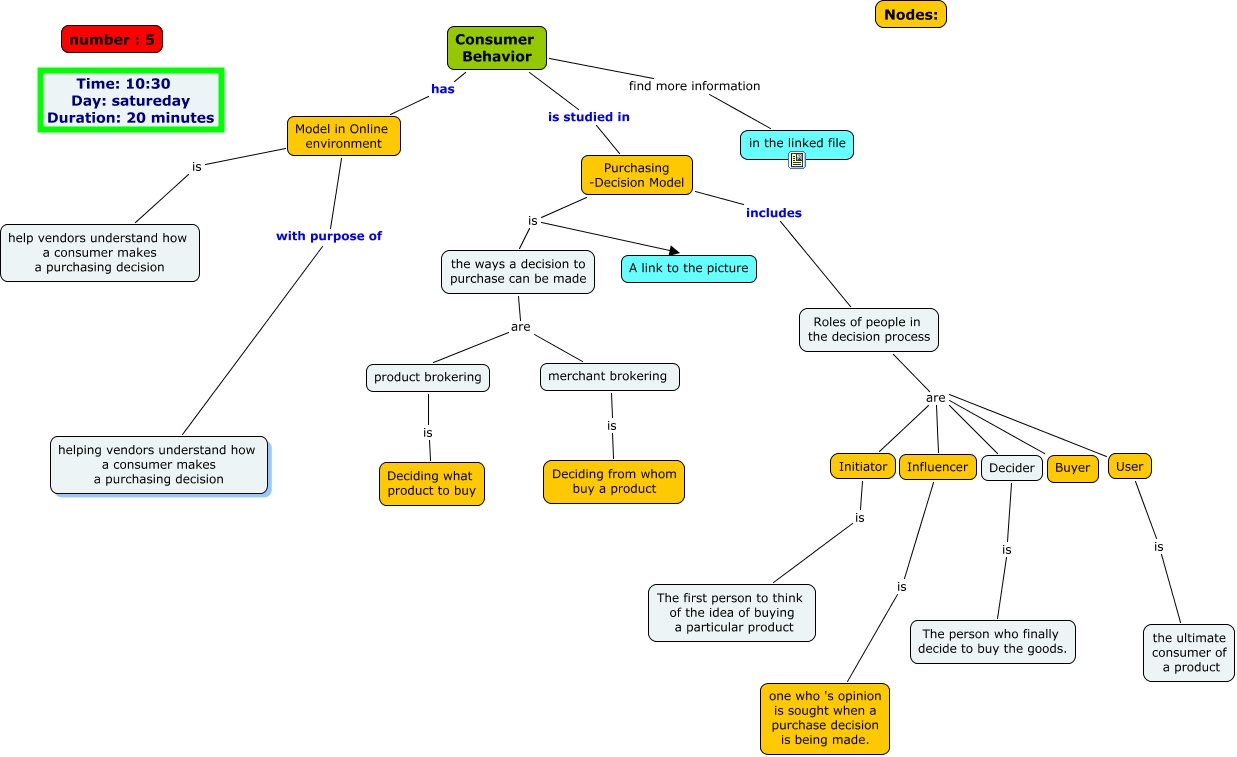 This Concept Map, created with IHMC CmapTools, has information related to: Consumer Behavior, product brokering is Deciding what product to buy, Roles of people in the decision process are Decider, Purchasing -Decision Model includes Roles of people in the decision process, Model in Online environment with purpose of helping vendors understand how a consumer makes a purchasing decision, Roles of people in the decision process are Influencer, Consumer Behavior find more information in the linked file, Model in Online environment is help vendors understand how a consumer makes a purchasing decision, merchant brokering is Deciding from whom buy a product, Roles of people in the decision process are User, Consumer Behavior is studied in Purchasing -Decision Model, Roles of people in the decision process are Initiator, the ways a decision to purchase can be made are merchant brokering, Purchasing -Decision Model is A link to the picture, Influencer is one who 's opinion is sought when a purchase decision is being made., Decider is The person who finally decide to buy the goods., Consumer Behavior has Model in Online environment, User is the ultimate consumer of a product, the ways a decision to purchase can be made are product brokering, Purchasing -Decision Model is the ways a decision to purchase can be made, Roles of people in the decision process are Buyer