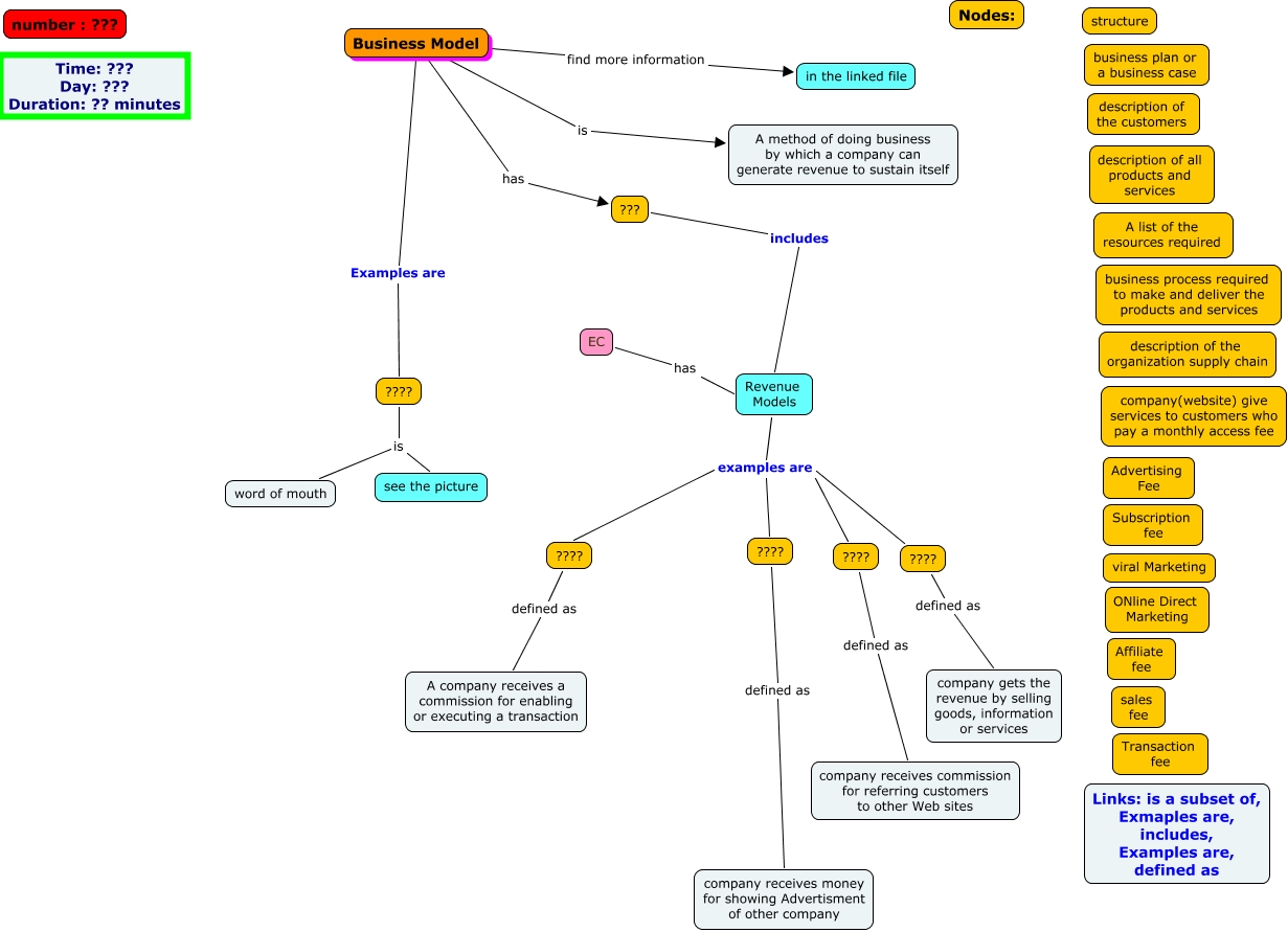 This Concept Map, created with IHMC CmapTools, has information related to: Business Model, ???? defined as A company receives a commission for enabling or executing a transaction, Business Model Examples are ????, ???? defined as company receives commission for referring customers to other Web sites, Revenue Models examples are ????, Business Model find more information in the linked file, ???? defined as company receives money for showing Advertisment of other company, ??? includes Revenue Models, ???? is word of mouth, Revenue Models examples are ????, Business Model is A method of doing business by which a company can generate revenue to sustain itself, Revenue Models examples are ????, Revenue Models examples are ????, EC has Revenue Models, ???? is see the picture, Business Model has ???, ???? defined as company gets the revenue by selling goods, information or services