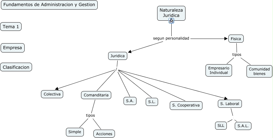 Este Cmap, tiene información relacionada con: Tema 1 Empresa Clasificacion Naturaleza Juridica, Juridica / S.A., Naturaleza Juridica segun personalidad Fisica, Juridica / S.L., Comanditaria tipos Simple, Juridica / Colectiva, Fisica tipos Empresario Individual, Juridica / S. Cooperativa, Comanditaria tipos Acciones, S. Laboral S.A.L., S. Laboral SLL, Naturaleza Juridica segun personalidad Juridica, Juridica / S. Laboral, Juridica / Comanditaria, Fisica tipos Comunidad bienes