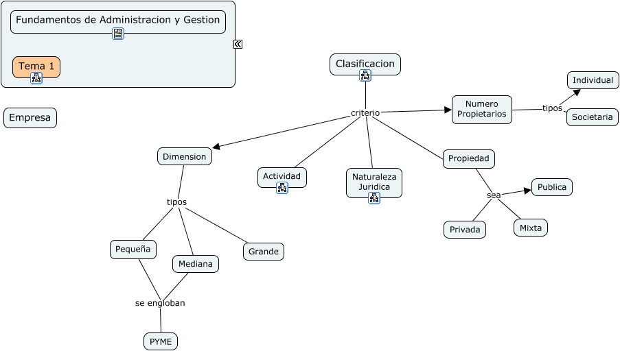 Este Cmap, tiene información relacionada con: Tema 1 Empresa Clasificacion, Clasificacion criterio Numero Propietarios, Dimension tipos Pequeña, Propiedad sea Privada, Numero Propietarios tipos Individual, Numero Propietarios tipos Societaria, Dimension tipos Mediana, Mediana se engloban PYME, Propiedad sea Publica, Clasificacion criterio Actividad, Pequeña se engloban PYME, Dimension tipos Grande, Clasificacion criterio Naturaleza Juridica, Propiedad sea Mixta, Clasificacion criterio Dimension, Clasificacion criterio Propiedad