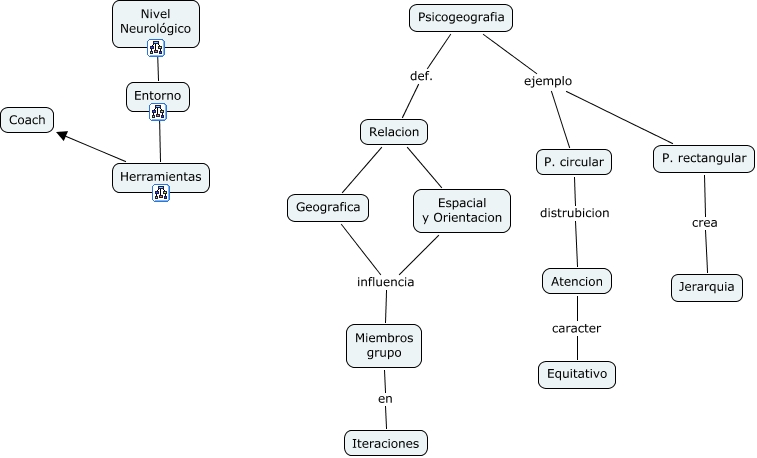 Este Cmap, tiene información relacionada con: Herramientas Entorno Psicografia, Espacial y Orientacion influencia Miembros grupo, Geografica influencia Miembros grupo, Miembros grupo en Iteraciones, Nivel Neurológico Entorno, Relacion Geografica, Entorno Herramientas, P. rectangular crea Jerarquia, Psicogeografia ejemplo P. circular, P. circular distrubicion Atencion, Atencion caracter Equitativo, Psicogeografia def. Relacion, Herramientas Coach, Relacion Espacial y Orientacion, Psicogeografia ejemplo P. rectangular