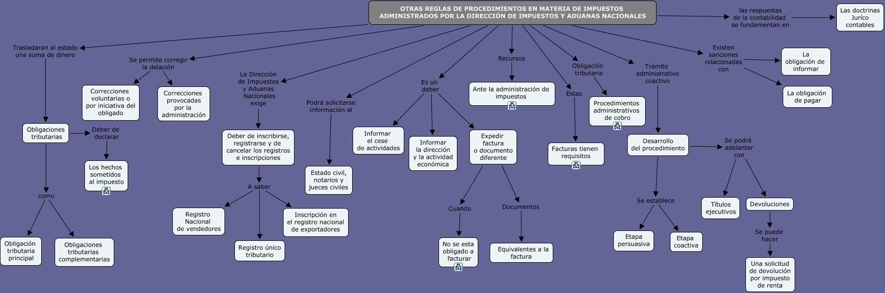 Este Cmap, tiene información relacionada con: Otras reglas de procedimientos, OTRAS REGLAS DE PROCEDIMIENTOS EN MATERIA DE IMPUESTOS ADMINISTRADOS POR LA DIRECCIÓN DE IMPUESTOS Y ADUANAS NACIONALES Trasladaran al estado una suma de dinero Obligaciones tributarias, Deber de inscribirse, registrarse y de cancelar los registros e inscripciones A saber Registro Nacional de vendedores, Desarrollo del procedimiento Se podrá adelantar con Títulos ejecutivos, OTRAS REGLAS DE PROCEDIMIENTOS EN MATERIA DE IMPUESTOS ADMINISTRADOS POR LA DIRECCIÓN DE IMPUESTOS Y ADUANAS NACIONALES Existen sanciones relacionadas con La obligación de informar, Expedir factura o documento diferente Cuando No se esta obligado a facturar, OTRAS REGLAS DE PROCEDIMIENTOS EN MATERIA DE IMPUESTOS ADMINISTRADOS POR LA DIRECCIÓN DE IMPUESTOS Y ADUANAS NACIONALES Obligación tributaria Procedimientos administrativos de cobro, OTRAS REGLAS DE PROCEDIMIENTOS EN MATERIA DE IMPUESTOS ADMINISTRADOS POR LA DIRECCIÓN DE IMPUESTOS Y ADUANAS NACIONALES las respuestas de la contabilidad se fundamentan en Las doctrinas Juríco contables, Expedir factura o documento diferente Documentos Equivalentes a la factura, OTRAS REGLAS DE PROCEDIMIENTOS EN MATERIA DE IMPUESTOS ADMINISTRADOS POR LA DIRECCIÓN DE IMPUESTOS Y ADUANAS NACIONALES Podrá solicitarse información al Estado civil, notarios y jueces civiles, OTRAS REGLAS DE PROCEDIMIENTOS EN MATERIA DE IMPUESTOS ADMINISTRADOS POR LA DIRECCIÓN DE IMPUESTOS Y ADUANAS NACIONALES La Dirección de Impuestos y Aduanas Nacionales exige Deber de inscribirse, registrarse y de cancelar los registros e inscripciones, Desarrollo del procedimiento Se establece Etapa persuasiva, Obligaciones tributarias Deber de declarar Los hechos sometidos al impuesto, OTRAS REGLAS DE PROCEDIMIENTOS EN MATERIA DE IMPUESTOS ADMINISTRADOS POR LA DIRECCIÓN DE IMPUESTOS Y ADUANAS NACIONALES Estas Facturas tienen requisitos, Desarrollo del procedimiento Se podrá adelantar con Devoluciones, OTRAS REGLAS DE PROCEDIMIENTOS EN MATERIA DE IMPUESTOS ADMINISTRADOS POR LA DIRECCIÓN DE IMPUESTOS Y ADUANAS NACIONALES Se permite corregir la delación Correcciones voluntarias o por iniciativa del obligado, Devoluciones Se puede hacer Una solicitud de devolución por impuesto de renta, OTRAS REGLAS DE PROCEDIMIENTOS EN MATERIA DE IMPUESTOS ADMINISTRADOS POR LA DIRECCIÓN DE IMPUESTOS Y ADUANAS NACIONALES Trámite administrativo coactivo Desarrollo del procedimiento, Obligaciones tributarias como Obligaciones tributarias complementarias, OTRAS REGLAS DE PROCEDIMIENTOS EN MATERIA DE IMPUESTOS ADMINISTRADOS POR LA DIRECCIÓN DE IMPUESTOS Y ADUANAS NACIONALES Existen sanciones relacionadas con La obligación de pagar, OTRAS REGLAS DE PROCEDIMIENTOS EN MATERIA DE IMPUESTOS ADMINISTRADOS POR LA DIRECCIÓN DE IMPUESTOS Y ADUANAS NACIONALES Se permite corregir la delación Correcciones provocadas por la administración