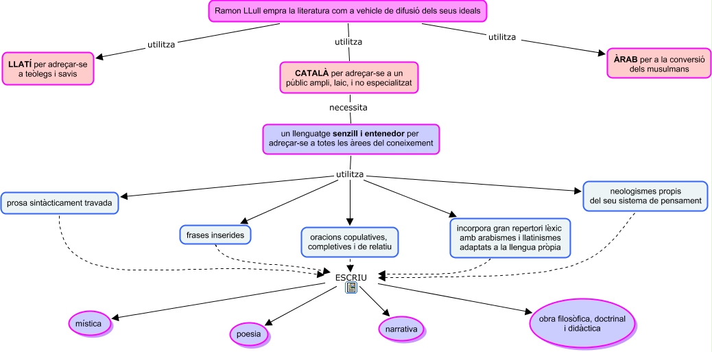 Este Cmap, tiene información relacionada con: La literatura com a vehicle_Ramon Llull, incorpora gran repertori lèxic amb arabismes i llatinismes adaptats a la llengua pròpia ESCRIU narrativa, oracions copulatives, completives i de relatiu ESCRIU poesia, un llenguatge senzill i entenedor per adreçar-se a totes les àrees del coneixement utilitza prosa sintàcticament travada, incorpora gran repertori lèxic amb arabismes i llatinismes adaptats a la llengua pròpia ESCRIU mística, frases inserides ESCRIU obra filosòfica, doctrinal i didàctica, prosa sintàcticament travada ESCRIU poesia, un llenguatge senzill i entenedor per adreçar-se a totes les àrees del coneixement utilitza neologismes propis del seu sistema de pensament, prosa sintàcticament travada ESCRIU obra filosòfica, doctrinal i didàctica, neologismes propis del seu sistema de pensament ESCRIU poesia, incorpora gran repertori lèxic amb arabismes i llatinismes adaptats a la llengua pròpia ESCRIU obra filosòfica, doctrinal i didàctica, incorpora gran repertori lèxic amb arabismes i llatinismes adaptats a la llengua pròpia ESCRIU poesia, frases inserides ESCRIU poesia, un llenguatge senzill i entenedor per adreçar-se a totes les àrees del coneixement utilitza frases inserides, frases inserides ESCRIU mística, neologismes propis del seu sistema de pensament ESCRIU obra filosòfica, doctrinal i didàctica, un llenguatge senzill i entenedor per adreçar-se a totes les àrees del coneixement utilitza incorpora gran repertori lèxic amb arabismes i llatinismes adaptats a la llengua pròpia, Ramon LLull empra la literatura com a vehicle de difusió dels seus ideals utilitza LLATÍ per adreçar-se a teòlegs i savis, oracions copulatives, completives i de relatiu ESCRIU narrativa, Ramon LLull empra la literatura com a vehicle de difusió dels seus ideals utilitza ÀRAB per a la conversió dels musulmans, frases inserides ESCRIU narrativa