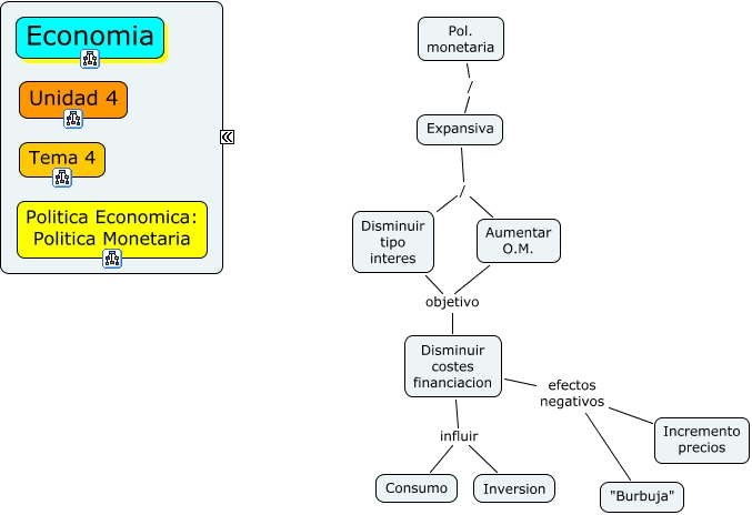 Este Cmap, tiene información relacionada con: Unidad 4 Tema 4 Politica Monetaria Expansiva, Disminuir costes financiacion influir Inversion, Pol. monetaria / Expansiva, Disminuir tipo interes objetivo Disminuir costes financiacion, Aumentar O.M. objetivo Disminuir costes financiacion, Disminuir costes financiacion influir Consumo, Expansiva / Disminuir tipo interes, Disminuir costes financiacion efectos negativos Incremento precios, Disminuir costes financiacion efectos negativos "Burbuja", Expansiva / Aumentar O.M.