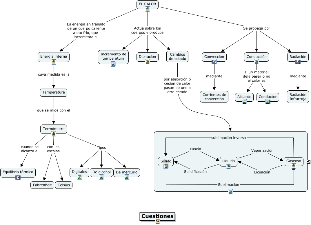 Este Cmap, tiene información relacionada con: Calor y temperatura, EL CALOR Actúa sobre los cuerpos y produce Cambios de estado, EL CALOR Actúa sobre los cuerpos y produce Dilatación, Sólido Fusión Líquido, EL CALOR Se propaga por Conducción, Líquido Solidificación Sólido, Cambios de estado por absorción o cesión de calor pasan de uno a otro estado Cambios de estado, Convección mediante Corrientes de convección, Termómetro cuando se alcanza el Equilibrio térmico, Termómetro con las escalas Fahrenheit, Termómetro con las escalas Celsius, EL CALOR Se propaga por Convección, Conducción si un material deja pasar o no el calor es Conductor, Sólido Sublimación Gaseoso, EL CALOR Actúa sobre los cuerpos y produce Incremento de temperatura, Radiación mediante Radiación Infrarroja, Conducción si un material deja pasar o no el calor es Aislante, Gaseoso Licuación Líquido, Energía interna cuya medida es la Temperatura, Gaseoso sublimación inversa Sólido, Termómetro Tipos De alcohol