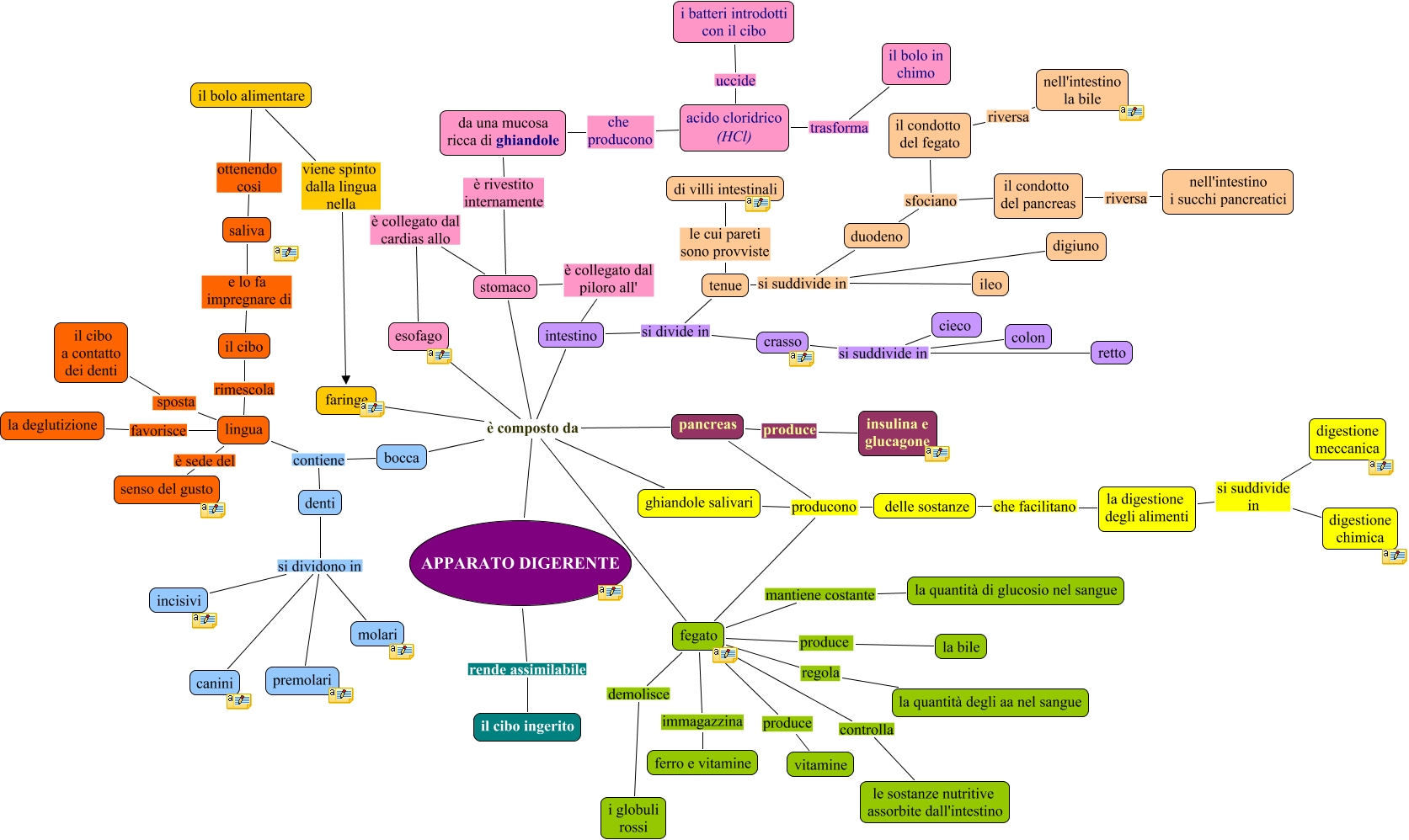 Questa Cmap, creata con IHMC CmapTools, contiene informazioni relative a: apparato digerente, pancreas producono delle sostanze, fegato producono delle sostanze, crasso si suddivide in colon, fegato produce la bile, crasso si suddivide in retto, denti si dividono in incisivi, acido cloridrico (HCl) uccide i batteri introdotti con il cibo, APPARATO DIGERENTE è composto da ghiandole salivari, ghiandole salivari producono delle sostanze, fegato regola la quantità degli aa nel sangue, intestino si divide in tenue, bocca contiene lingua, da una mucosa ricca di ghiandole che producono acido cloridrico (HCl), lingua è sede del senso del gusto, APPARATO DIGERENTE è composto da esofago, saliva ottenendo così il bolo alimentare, fegato mantiene costante la quantità di glucosio nel sangue, lingua favorisce la deglutizione, fegato produce vitamine, intestino si divide in crasso
