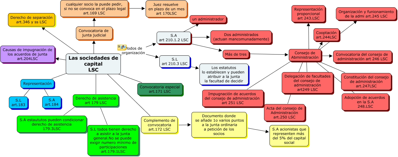 Este Cmap, tiene información relacionada con: Escenari 5, Complemento de convocatoria art.172 LSC ???? Documento donde se añade 1o varios puntos a la junta ordinaria a petición de los socios, Consejo de Abministración ???? Convocatoria del consejo de administración art 246 LSC, Las sociedades de capital LSC ???? Representación, Las sociedades de capital LSC ???? Causas de impugnación de los acuerdos de junta art.204LSC, Consejo de Abministración ???? Organización y funionamiento de la admi art.245 LSC, Las sociedades de capital LSC ???? Convocatoria especial art.171 LSC, Las sociedades de capital LSC ???? Convocatoria de junta judicial, Consejo de Abministración ???? Adopción de acuerdos en la S.A 248.LSC, S.A art 210.1.2 LSC ???? un administrador, Las sociedades de capital LSC ???? Derecho de asistencia art 179 LSC, Las sociedades de capital LSC ???? Complemento de convocatoria art.172 LSC, Documento donde se añade 1o varios puntos a la junta ordinaria a petición de los socios ???? S.A acionistas que representen más del 5% del capital social, Representación ???? S.A art.184, Representación ???? S.L art.183, Convocatoria de junta judicial ???? cualquier socio la puede pedir, si no se convoca en el plazo legal art.169 LSC, Consejo de Abministración ???? Cooptación art.244LSC, Consejo de Abministración ???? Representación proporcional art 243.LSC, Las sociedades de capital LSC Modos de organización S.L art 210.3 LSC, Consejo de Abministración ???? Acta del consejo de Administración art.250 LSC, S.A art 210.1.2 LSC ???? Dos administrados (actuan mancomunadamente)