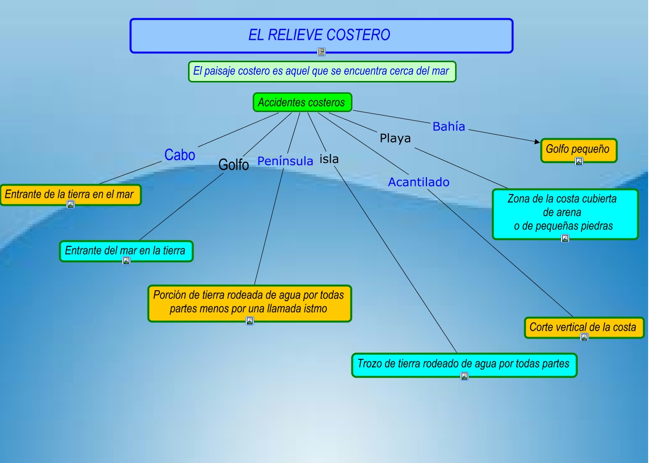 Este Cmap, tiene información relacionada con: ACCIDENTES DEL RELIEVE COSTERO 2º CICLO, Accidentes costeros Acantilado Corte vertical de la costa, Accidentes costeros Bahía Golfo pequeño, Accidentes costeros Playa Zona de la costa cubierta de arena o de pequeñas piedras, Accidentes costeros isla Trozo de tierra rodeado de agua por todas partes, Accidentes costeros Golfo Entrante del mar en la tierra, Accidentes costeros Cabo Entrante de la tierra en el mar, Accidentes costeros Península Porción de tierra rodeada de agua por todas partes menos por una llamada istmo