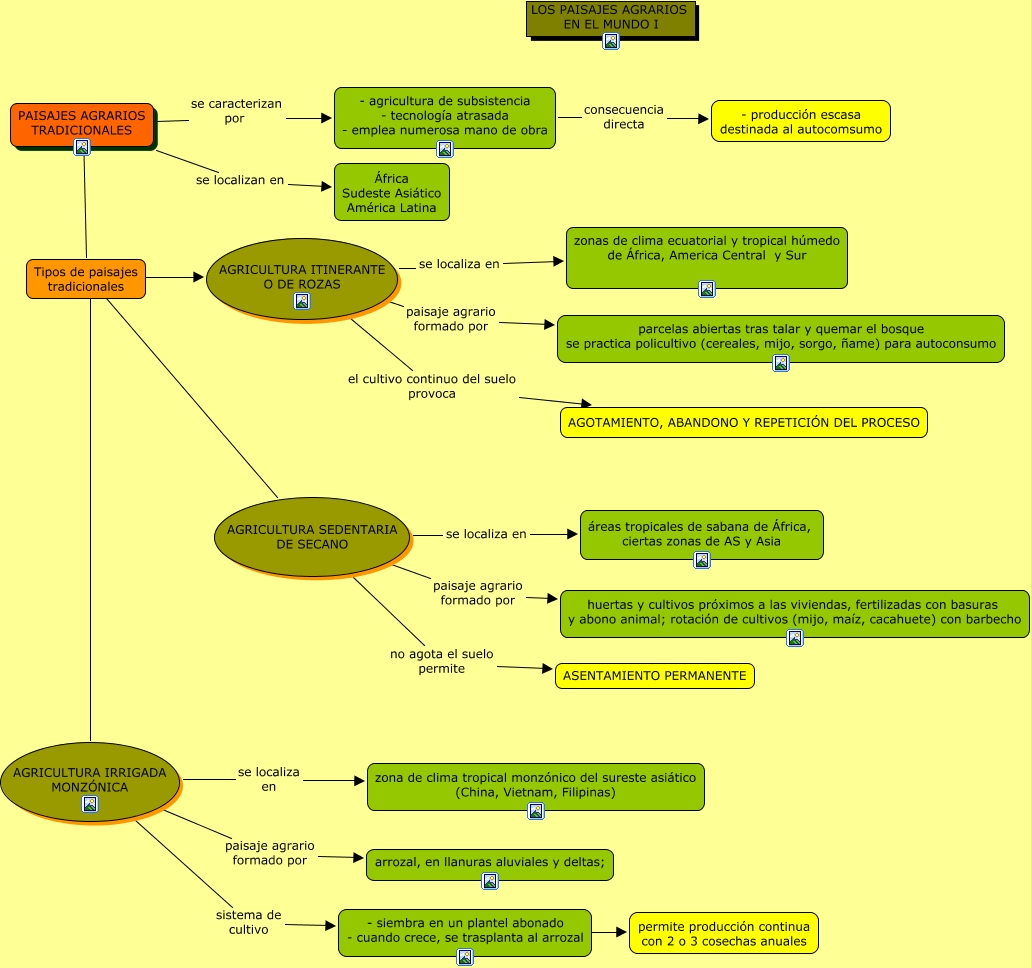 Este Cmap, tiene información relacionada con: Los paisajes agrarios tradicionales, Tipos de paisajes tradicionales ???? AGRICULTURA ITINERANTE O DE ROZAS, AGRICULTURA IRRIGADA MONZÓNICA se localiza en zona de clima tropical monzónico del sureste asiático (China, Vietnam, Filipinas), PAISAJES AGRARIOS TRADICIONALES se localizan en África Sudeste Asiático América Latina, PAISAJES AGRARIOS TRADICIONALES se caracterizan por - agricultura de subsistencia - tecnología atrasada - emplea numerosa mano de obra, AGRICULTURA ITINERANTE O DE ROZAS se localiza en zonas de clima ecuatorial y tropical húmedo de África, America Central y Sur, Tipos de paisajes tradicionales ???? AGRICULTURA IRRIGADA MONZÓNICA, AGRICULTURA IRRIGADA MONZÓNICA sistema de cultivo - siembra en un plantel abonado - cuando crece, se trasplanta al arrozal, AGRICULTURA ITINERANTE O DE ROZAS paisaje agrario formado por parcelas abiertas tras talar y quemar el bosque se practica policultivo (cereales, mijo, sorgo, ñame) para autoconsumo, AGRICULTURA SEDENTARIA DE SECANO paisaje agrario formado por huertas y cultivos próximos a las viviendas, fertilizadas con basuras y abono animal; rotación de cultivos (mijo, maíz, cacahuete) con barbecho, AGRICULTURA IRRIGADA MONZÓNICA paisaje agrario formado por arrozal, en llanuras aluviales y deltas;, - agricultura de subsistencia - tecnología atrasada - emplea numerosa mano de obra consecuencia directa - producción escasa destinada al autocomsumo, Tipos de paisajes tradicionales ???? AGRICULTURA SEDENTARIA DE SECANO, AGRICULTURA ITINERANTE O DE ROZAS el cultivo continuo del suelo provoca AGOTAMIENTO, ABANDONO Y REPETICIÓN DEL PROCESO, AGRICULTURA SEDENTARIA DE SECANO no agota el suelo permite ASENTAMIENTO PERMANENTE, - siembra en un plantel abonado - cuando crece, se trasplanta al arrozal ???? permite producción continua con 2 o 3 cosechas anuales, AGRICULTURA SEDENTARIA DE SECANO se localiza en áreas tropicales de sabana de África, ciertas zonas de AS y Asia, PAISAJES AGRARIOS TRADICIONALES ???? Tipos de paisajes tradicionales
