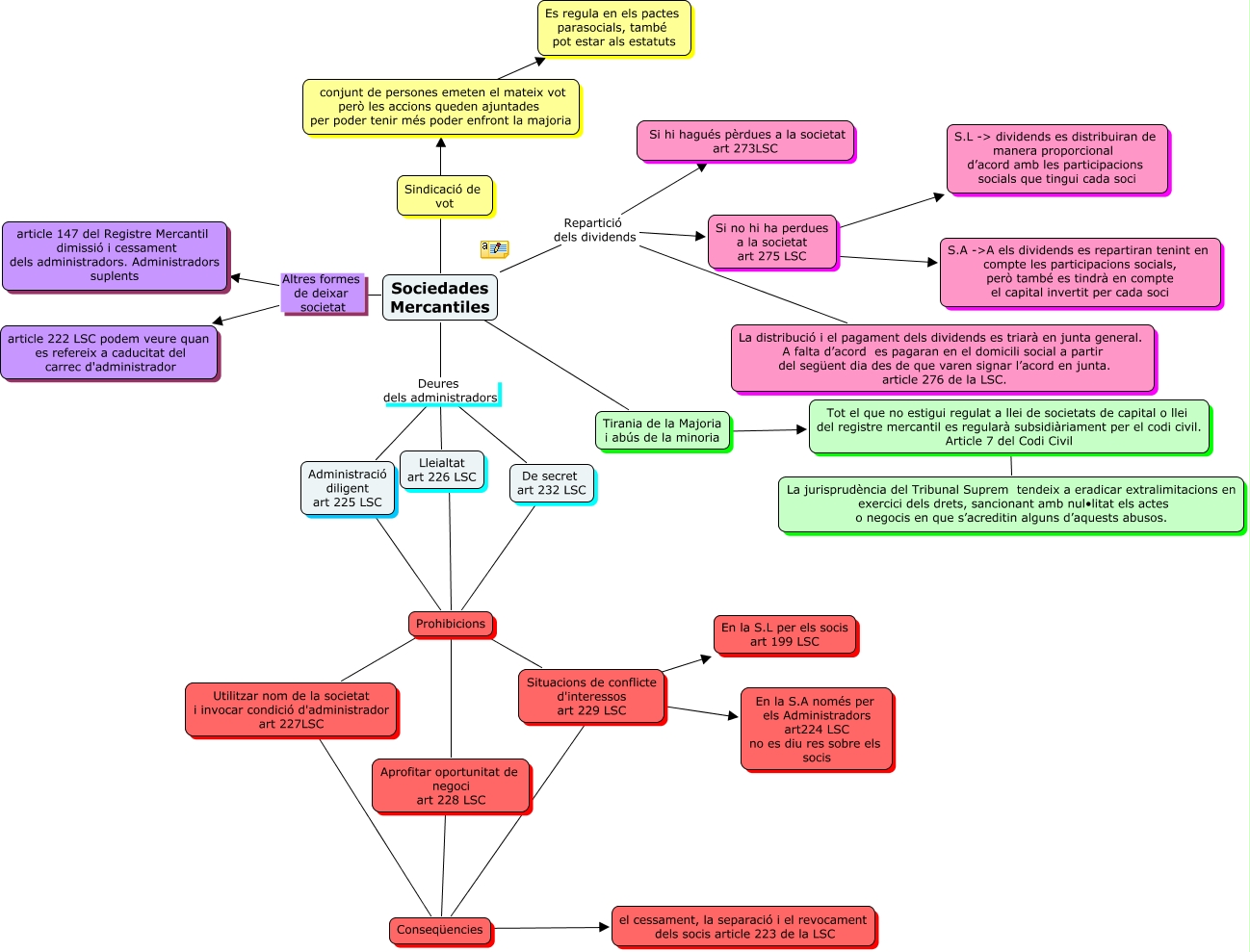 Este Cmap, tiene información relacionada con: Escenari 6, Sociedades Mercantiles Repartició dels dividends Si no hi ha perdues a la societat art 275 LSC, Sociedades Mercantiles Altres formes de deixar societat article 222 LSC podem veure quan es refereix a caducitat del carrec d'administrador, Aprofitar oportunitat de negoci art 228 LSC ???? Conseqüencies, Conseqüencies ???? el cessament, la separació i el revocament dels socis article 223 de la LSC, Sociedades Mercantiles Deures dels administradors Administració diligent art 225 LSC, Situacions de conflicte d'interessos art 229 LSC ???? En la S.L per els socis art 199 LSC, Lleialtat art 226 LSC ???? Prohibicions, Sociedades Mercantiles Repartició dels dividends Si hi hagués pèrdues a la societat art 273LSC, Si no hi ha perdues a la societat art 275 LSC ???? S.A ->A els dividends es repartiran tenint en compte les participacions socials, però també es tindrà en compte el capital invertit per cada soci, Prohibicions ???? Utilitzar nom de la societat i invocar condició d'administrador art 227LSC, Prohibicions ???? Aprofitar oportunitat de negoci art 228 LSC, Prohibicions ???? Situacions de conflicte d'interessos art 229 LSC, Sociedades Mercantiles ???? conjunt de persones emeten el mateix vot però les accions queden ajuntades per poder tenir més poder enfront la majoria, Situacions de conflicte d'interessos art 229 LSC ???? En la S.A només per els Administradors art224 LSC no es diu res sobre els socis, Situacions de conflicte d'interessos art 229 LSC ???? Conseqüencies, Administració diligent art 225 LSC ???? Prohibicions, Sociedades Mercantiles ???? Tirania de la Majoria i abús de la minoria, Sociedades Mercantiles Altres formes de deixar societat article 147 del Registre Mercantil dimissió i cessament dels administradors. Administradors suplents, Si no hi ha perdues a la societat art 275 LSC ???? S.L -> dividends es distribuiran de manera proporcional d’acord amb les participacions socials que tingui cada soci, Sociedades Mercantiles Deures dels administradors De secret art 232 LSC
