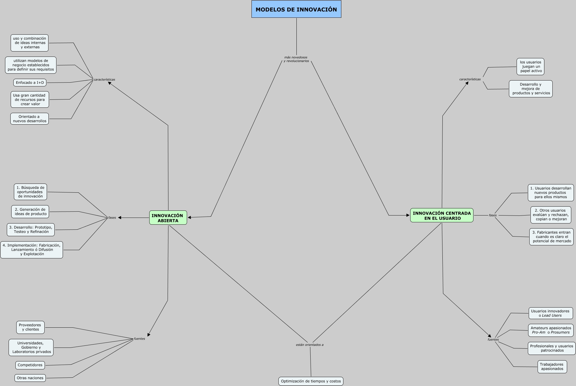 Este Cmap, tiene información relacionada con: SMiranda_Tarea4, INNOVACIÓN CENTRADA EN EL USUARIO fases 1. Usuarios desarrollan nuevos productos para ellos mismos, INNOVACIÓN ABIERTA fases 1. Búsqueda de oportunidades de innovación, INNOVACIÓN CENTRADA EN EL USUARIO fases 2. Otros usuarios evalúan y rechazan, copian o mejoran, INNOVACIÓN CENTRADA EN EL USUARIO fuentes Usuarios innovadores o Lead Users, los usuarios juegan un papel activo características Desarrollo y mejora de productos y servicios, INNOVACIÓN ABIERTA características Enfocado a I+D, INNOVACIÓN ABIERTA fases 3. Desarrollo: Prototipo, Testeo y Refinación, Orientado a nuevos desarrollos características Enfocado a I+D, INNOVACIÓN ABIERTA fases 2. Generación de ideas de producto, Orientado a nuevos desarrollos características utilizan modelos de negocio establecidos para definir sus requisitos, INNOVACIÓN CENTRADA EN EL USUARIO fuentes Trabajadores apasionados, INNOVACIÓN CENTRADA EN EL USUARIO características Desarrollo y mejora de productos y servicios, INNOVACIÓN ABIERTA fuentes Otras naciones, INNOVACIÓN ABIERTA fuentes Competidores, MODELOS DE INNOVACIÓN más novedosos y revolucionarios INNOVACIÓN ABIERTA, INNOVACIÓN CENTRADA EN EL USUARIO fuentes Amateurs apasionados Pro-Am o Prosumers, MODELOS DE INNOVACIÓN más novedosos y revolucionarios INNOVACIÓN CENTRADA EN EL USUARIO, Orientado a nuevos desarrollos características uso y combinación de ideas internas y externas, Optimización de tiempos y costos están orientados a INNOVACIÓN ABIERTA, Optimización de tiempos y costos están orientados a INNOVACIÓN CENTRADA EN EL USUARIO