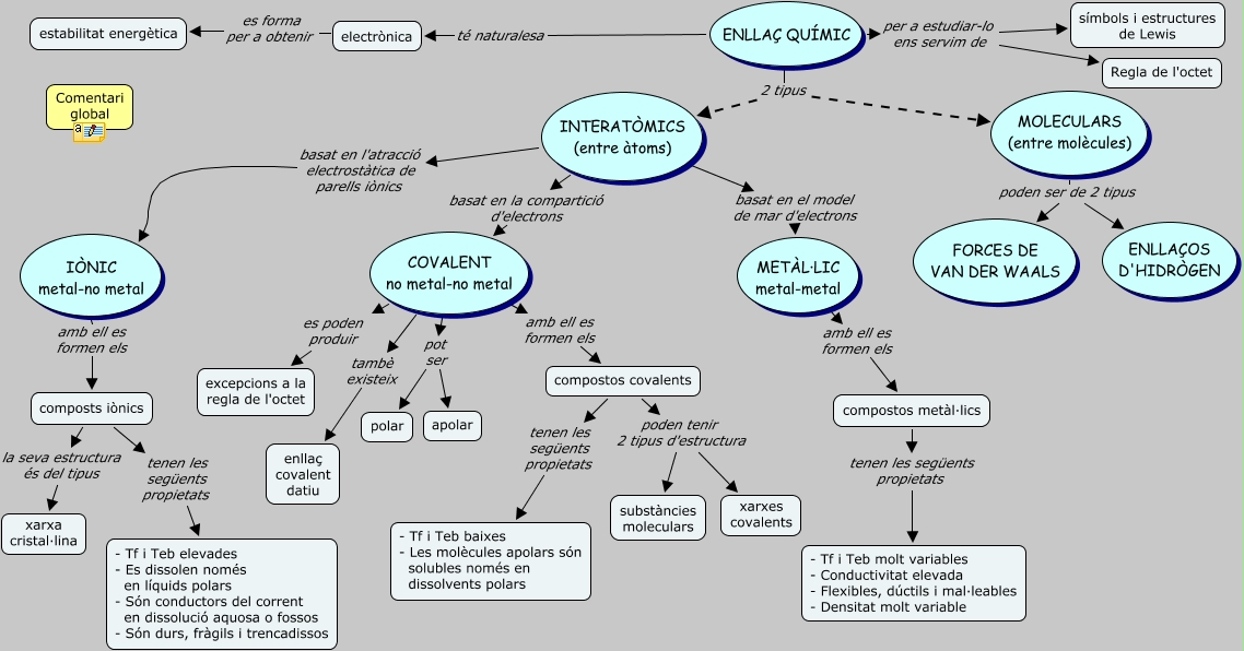 Aquest mapa conceptual conté informació relacionada amb: TASCA 3, COVALENT no metal-no metal pot ser polar, ENLLAÇ QUÍMIC 2 tipus INTERATÒMICS (entre àtoms), COVALENT no metal-no metal es poden produir excepcions a la regla de l'octet, METÀL·LIC metal-metal amb ell es formen els compostos metàl·lics, INTERATÒMICS (entre àtoms) basat en el model de mar d'electrons METÀL·LIC metal-metal, ENLLAÇ QUÍMIC per a estudiar-lo ens servim de Regla de l'octet, compostos covalents tenen les següents propietats - Tf i Teb baixes - Les molècules apolars són solubles només en dissolvents polars, compostos metàl·lics tenen les següents propietats - Tf i Teb molt variables - Conductivitat elevada - Flexibles, dúctils i mal·leables - Densitat molt variable, IÒNIC metal-no metal amb ell es formen els composts iònics, ENLLAÇ QUÍMIC té naturalesa electrònica, COVALENT no metal-no metal amb ell es formen els compostos covalents, compostos covalents poden tenir 2 tipus d'estructura xarxes covalents, electrònica es forma per a obtenir estabilitat energètica, COVALENT no metal-no metal pot ser apolar, INTERATÒMICS (entre àtoms) basat en la compartició d'electrons COVALENT no metal-no metal, ENLLAÇ QUÍMIC per a estudiar-lo ens servim de símbols i estructures de Lewis, COVALENT no metal-no metal tambè existeix enllaç covalent datiu, composts iònics tenen les següents propietats - Tf i Teb elevades - Es dissolen només en líquids polars - Són conductors del corrent en dissolució aquosa o fossos - Són durs, fràgils i trencadissos, compostos covalents poden tenir 2 tipus d'estructura substàncies moleculars, composts iònics la seva estructura és del tipus xarxa cristal·lina