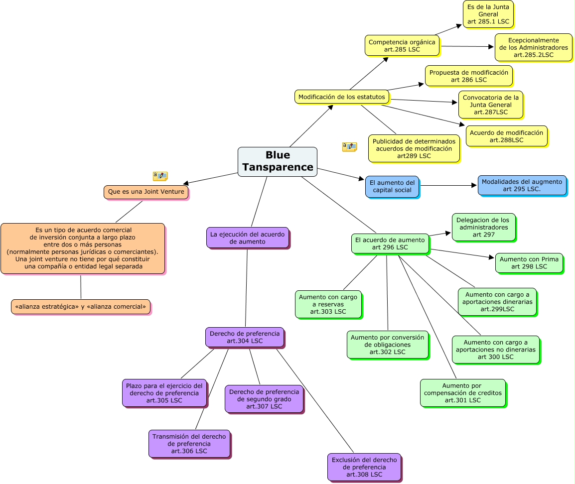 Este Cmap, tiene información relacionada con: Escenari 8, Que es una Joint Venture ???? Es un tipo de acuerdo comercial de inversión conjunta a largo plazo entre dos o más personas (normalmente personas jurídicas o comerciantes). Una joint venture no tiene por qué constituir una compañía o entidad legal separada, Modificación de los estatutos ???? Propuesta de modificación art 286 LSC, Blue Tansparence ???? El aumento del capital social, El acuerdo de aumento art 296 LSC ???? Aumento con cargo a aportaciones dinerarias art.299LSC, Competencia orgánica art.285 LSC ???? Es de la Junta Gneral art 285.1 LSC, Derecho de preferencia art.304 LSC ???? Plazo para el ejercicio del derecho de preferencia art.305 LSC, El acuerdo de aumento art 296 LSC ???? Aumento por compensación de creditos art.301 LSC, Derecho de preferencia art.304 LSC ???? Derecho de preferencia de segundo grado art.307 LSC, Blue Tansparence ???? Que es una Joint Venture, La ejecución del acuerdo de aumento ???? Derecho de preferencia art.304 LSC, Modificación de los estatutos ???? Publicidad de determinados acuerdos de modificación art289 LSC, Modificación de los estatutos ???? Acuerdo de modificación art.288LSC, El acuerdo de aumento art 296 LSC ???? Aumento con cargo a reservas art.303 LSC, El acuerdo de aumento art 296 LSC ???? Aumento con Prima art 298 LSC, El acuerdo de aumento art 296 LSC ???? Aumento por conversión de obligaciones art.302 LSC, El acuerdo de aumento art 296 LSC ???? Delegacion de los administradores art 297, El aumento del capital social ???? Modalidades del augmento art 295 LSC., Modificación de los estatutos ???? Convocatoria de la Junta General art.287LSC, Blue Tansparence ???? El acuerdo de aumento art 296 LSC, El acuerdo de aumento art 296 LSC ???? Aumento con cargo a aportaciones no dinerarias art 300 LSC